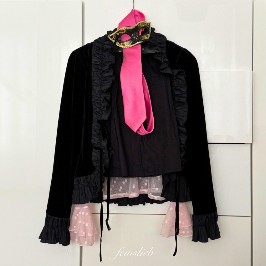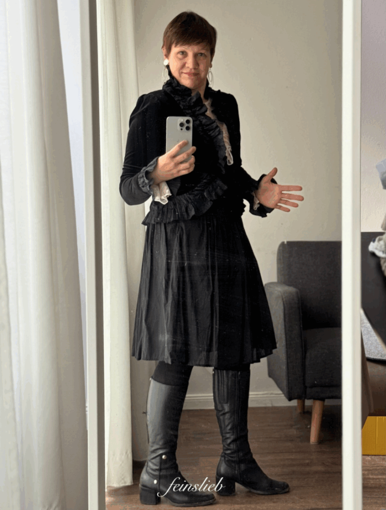7. Die Samtjacke mit den Rüschen mag ich sehr, der Rock ist allerdings ein bisschen unbequem.