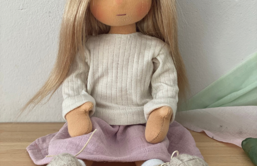 Für die „kleine Maike“-Puppe näht die Tochter einen rosa Sommer-Rock. Die Puppe stellt mich als 11-jähriges Mädchen dar. Ich habe sie vor zwei Jahren im Rahmen der PuppenMitMacherei von Mariengold und 1000Rehe genäht; das war ein sehr schöner Prozess, hier, hier und hier nachzulesen.