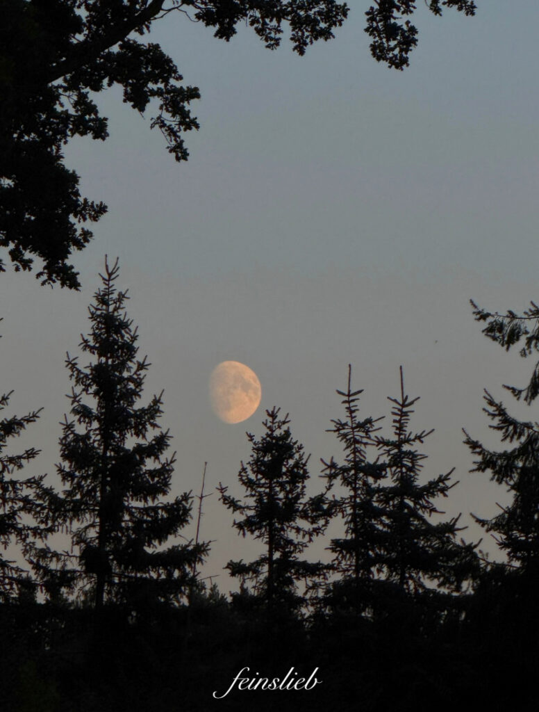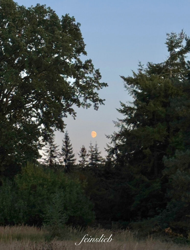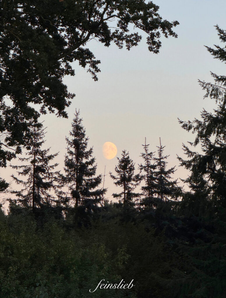 Am Freitag Abend sind wir draußen rund ums Glashaus und staunen über den riesigen gelben Mond, der zwischen den Bäumen aufsteigt.