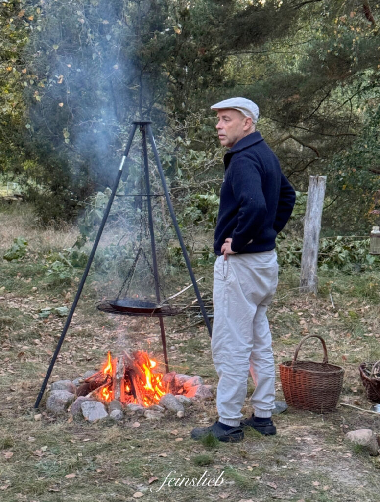 Wir brutzeln uns zum Abendessen über dem Feuer eine Pilzpfanne mit Kartoffeln.