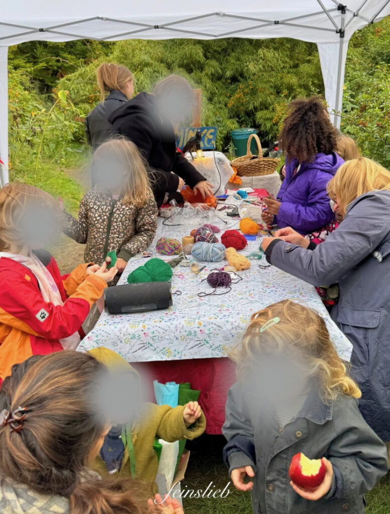 In unserer Wohnanlage haben Nachbar*innen ein kleines Fest organisiert, mit Kaffee/Kuchen, Spielen für die Kinder und Basteltisch. Erst basteln wir Schmuck, dann wollen alle Kastanien-Spinnennetze machen, weil ein paar Kinder Kastanien gesammelt haben. Also hole ich schnell unsere Wolle, Zahnstocher und Bohrer, und alle fangen an, Spinnennetze zu wickeln. Allerliebst. Meine Tochter leitet die kleinen Kinder an und hilft ihnen später noch beim Schmuck basteln.