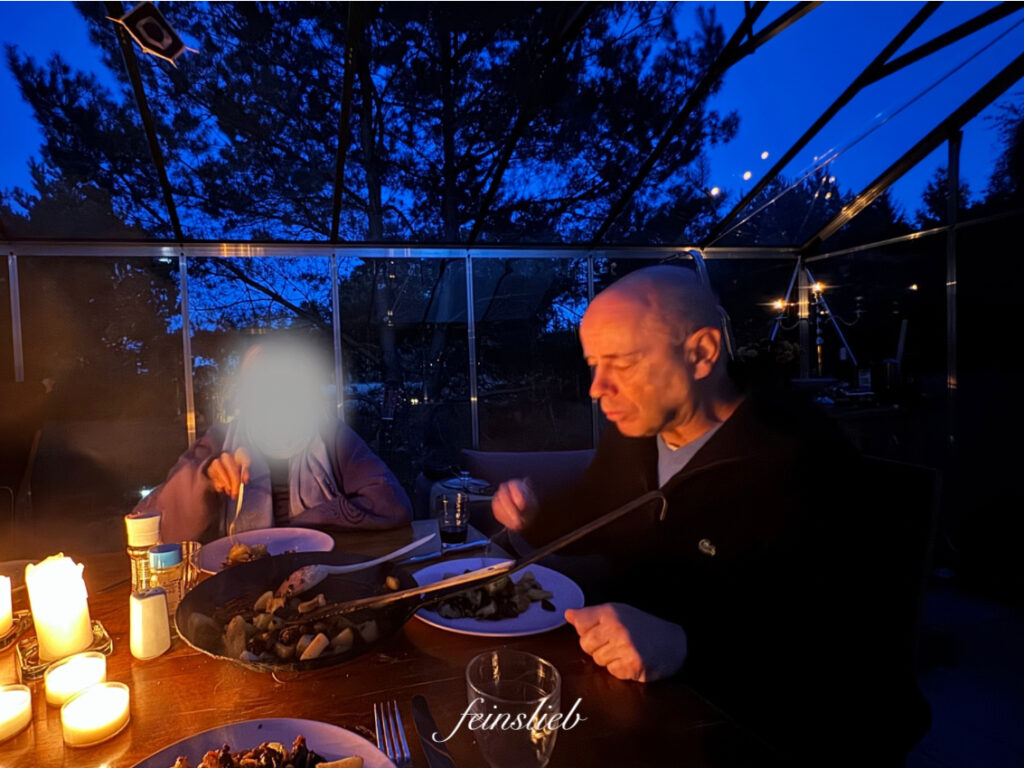 Die Pilzpfanne essen wir im Glashaus. Dabei scheinen die Sterne zu uns herein. Wir spielen ein Frage- und Antwort-Spiel, das sich grundsätzlich mein Bruder und meine Nichte ausgedacht haben, das wir für unsere Familie aber weiter entwickelt haben. Es ist super lustig – im Grunde erfindet man zusammen nach und nach eine völlig absurde, durchgeknallte Geschichte, die aber vollkommen logisch ist. An diesem Abend geht es um ein Paar Ballettschuhe, in deren Sohle ein Code eingraviert ist und die einst dem berühmten Balletttänzer Mikhail Baryshnikov gehörten. Die Ballettschuhe sind aktuell im Keller eines venezianischen Wohnhauses versteckt und werden von verschiedenen Geheimdiensten gesucht, darunter der Geheimdienst der australischen Aborigines (!!). Der Code auf der Sohle öffnet ein Portal in Venedig, das einen in die Zeit des Seidenhandels im 16. Jahrhundert katapultiert. Wenn man den Code kennt und an der richtigen Stelle in Venedig einsetzt, landet man in einer alten Seidenhandel-Straße.