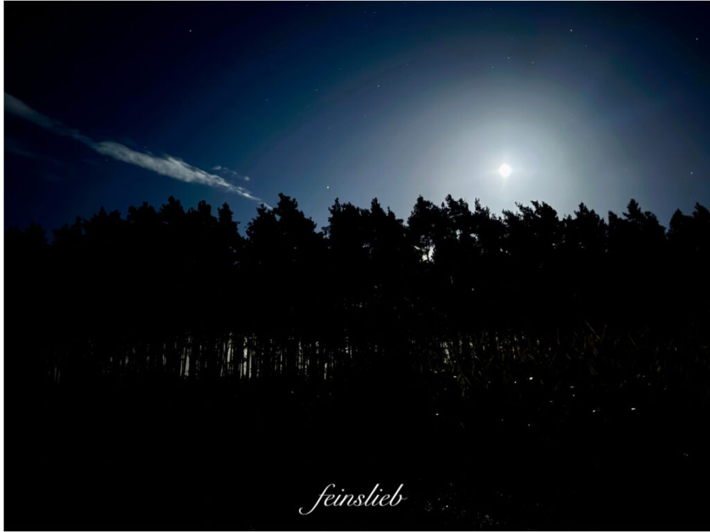 Nach dem Abendessen gehe ich nochmal mit den Hunden raus, auf einen längeren Spaziergang. Die Regenwolken haben sich verzogen, die Sterne übersäen den Nachthimmel. Der Mond erleuchtet die Landschaft so hell, dass man das Gefühl hat, es sei Tag.