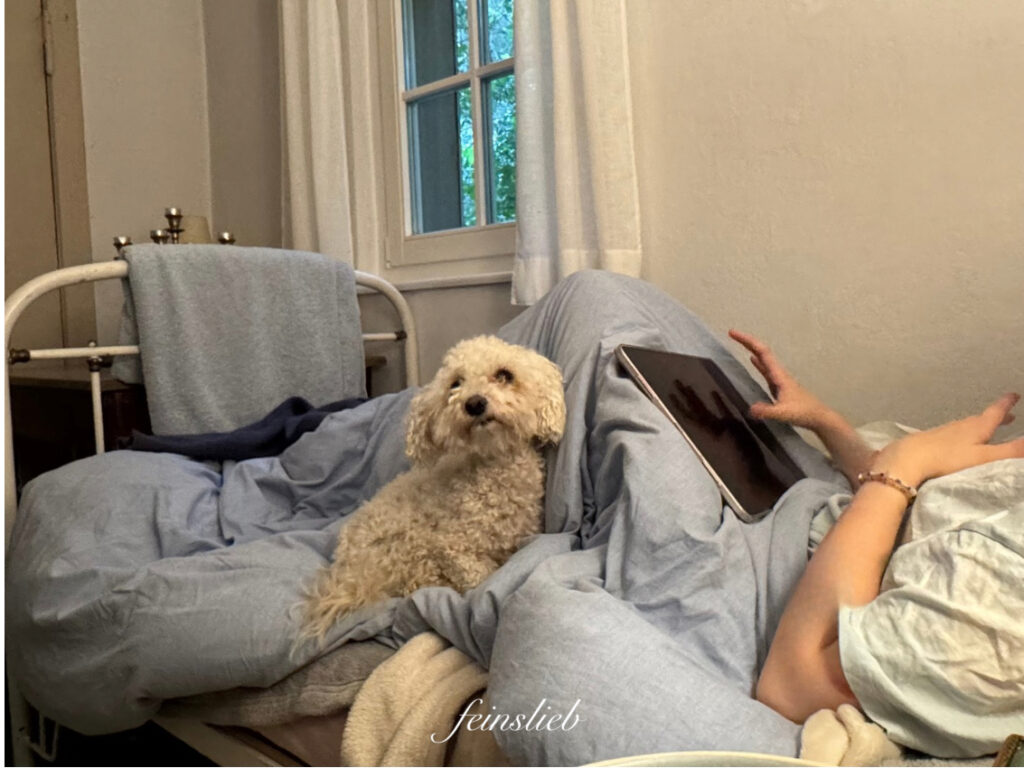 Großes Kind mit Hündchen im Bett, einen Film schauend.