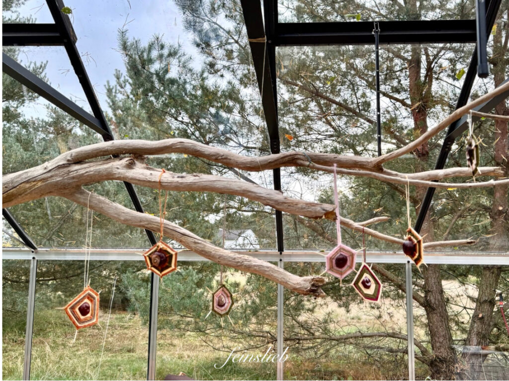 Aber wir machen immerhin ein paar Kastanien-Spinnennetze (hier zur Anleitung) und dekorieren damit das Glashaus.