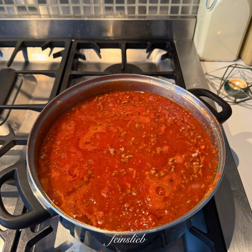 Meine erste Tagestat: Einen riesigen Topf Salsa Bolognese kochen, für eine 10-Personen-Lasagne für heute Abend. Bei uns kommt immer verhältnismäßig viel Karotte und Tomate in die Sauce, nicht übermäßig viel Fleisch.