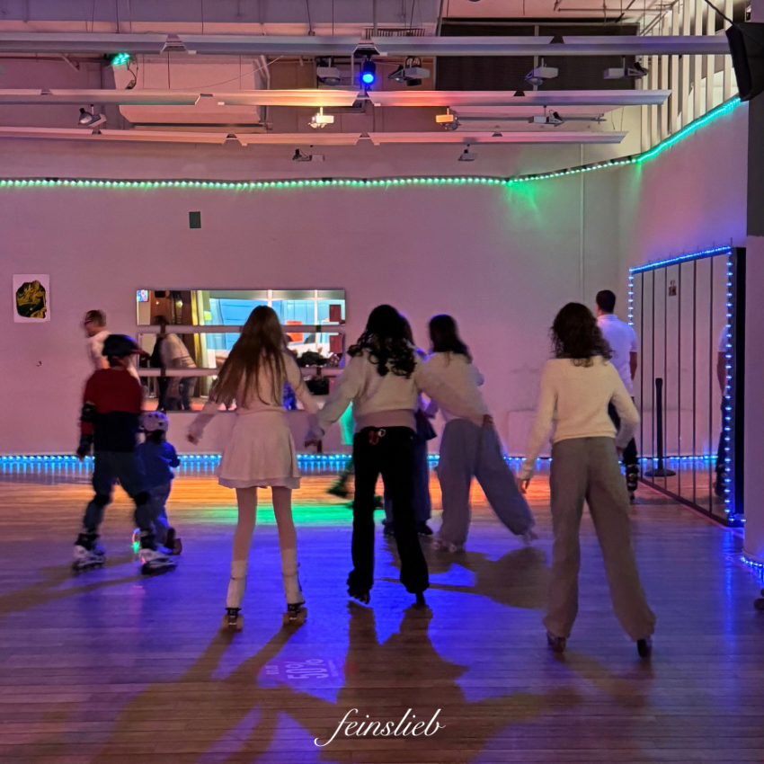 9 Teenager-Mädchen auf dem Weg zur Rollerdisko.