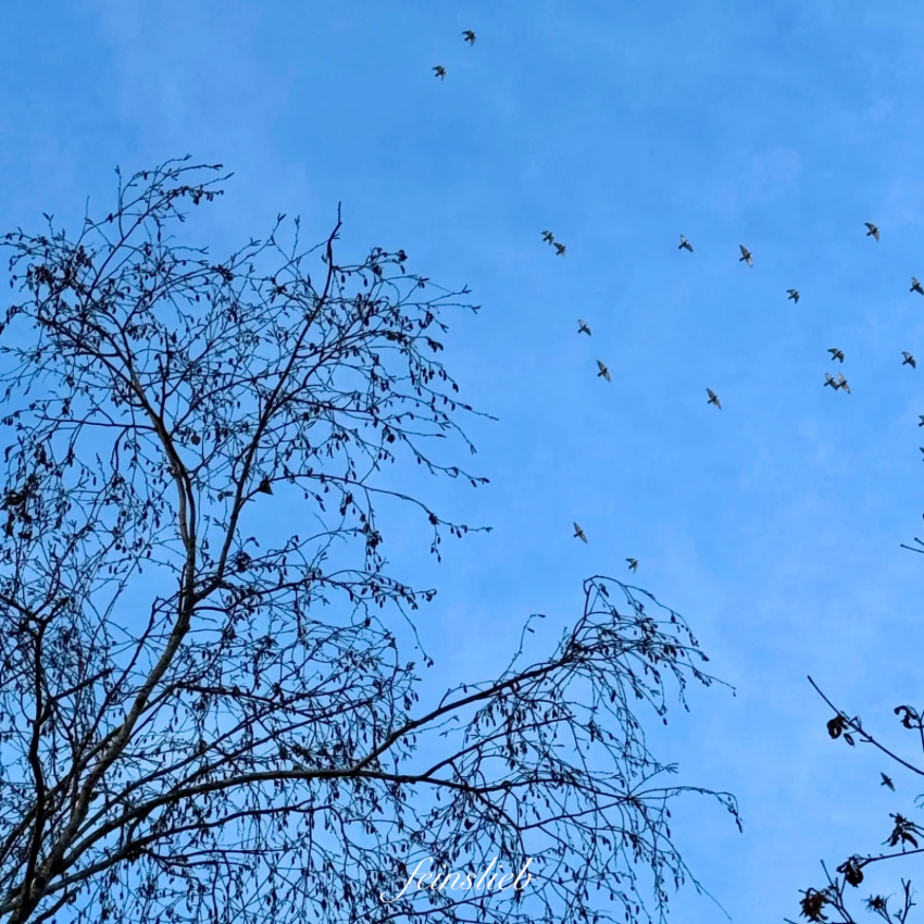 Aber einen Blick weiter: Kahler Baum und Vogelschwarm.