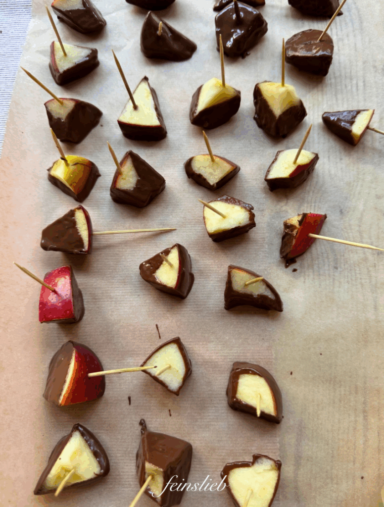 Das Kind tunkt für die Party Apfelstücke in Schokolade.