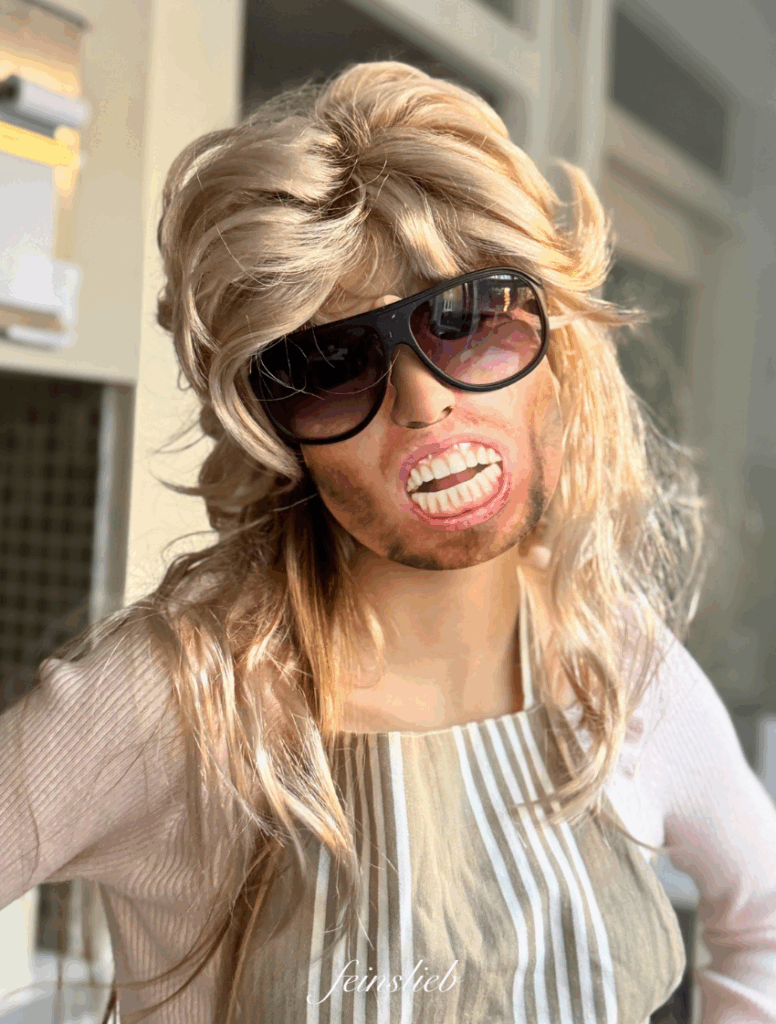 Sie probiert einen Look schonmal aus, mit 80er-Perücke.