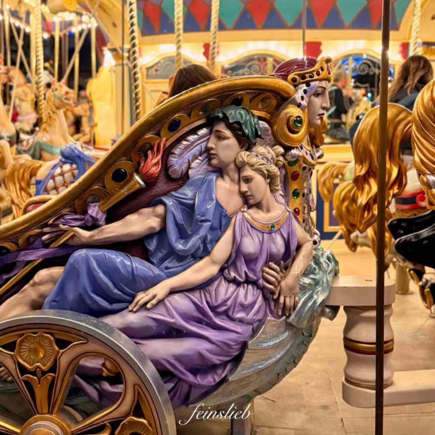 Wir alle vier fahren noch mit dem klassischen Karussell mit Pferden und Kutschen. Hier ein Detail einer Kutsche, in der man bei der Karussellfahrt sitzen kann.