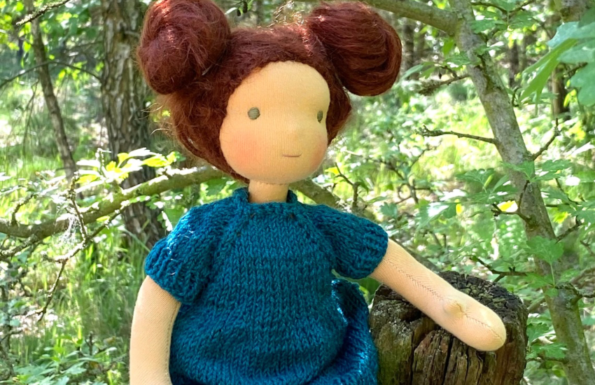 Ich mache ein paar Fotos von Puppe Lisi. Man kann sie aktuell bei mir kaufen, sie ist von mir selbst genäht; die Kleidung natürlich auch. Ich bin ja nebenbei auch Puppenmacherin. Lisi ist 30 cm groß und aus hochwertigen Naturmaterialien. Das Kleid habe ich natürlich auch gestrickt.