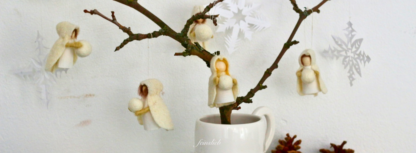 Natürlich kann man auf diese Weise auch andere Puppen für den Jahreszeitentisch basteln, z.B. Blütenkinder in Rosa und Grün für den Frühling, oder Herbstkinder mit Eichelhütchen auf dem Kopf und orangenen und braunen Kutten.