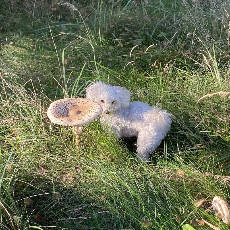 Hund Emma bei einem Riesen-Parasol auf unserem Grudnstück. Er sieht so aus, als würden Elfen darunter wohnen.