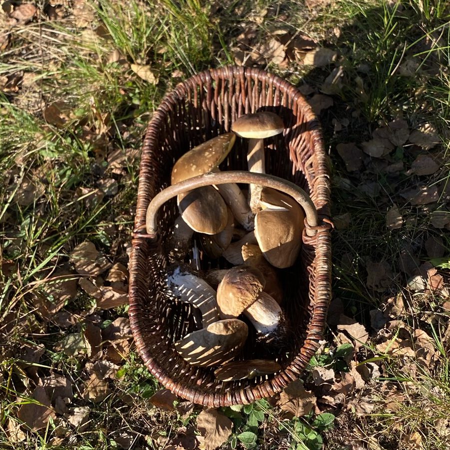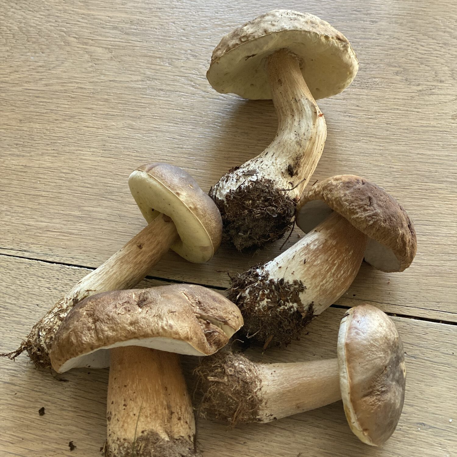 Wir sammeln die Pilze auf dem Grundstück ein. Wir müssen Pilze hier ja nicht suchen. Sie wachsen einfach rund ums Haus, weil hier früher Wald war und das Pilz-Myzel eben noch vorhanden ist. Lauter dicke, fette Steinpilze.