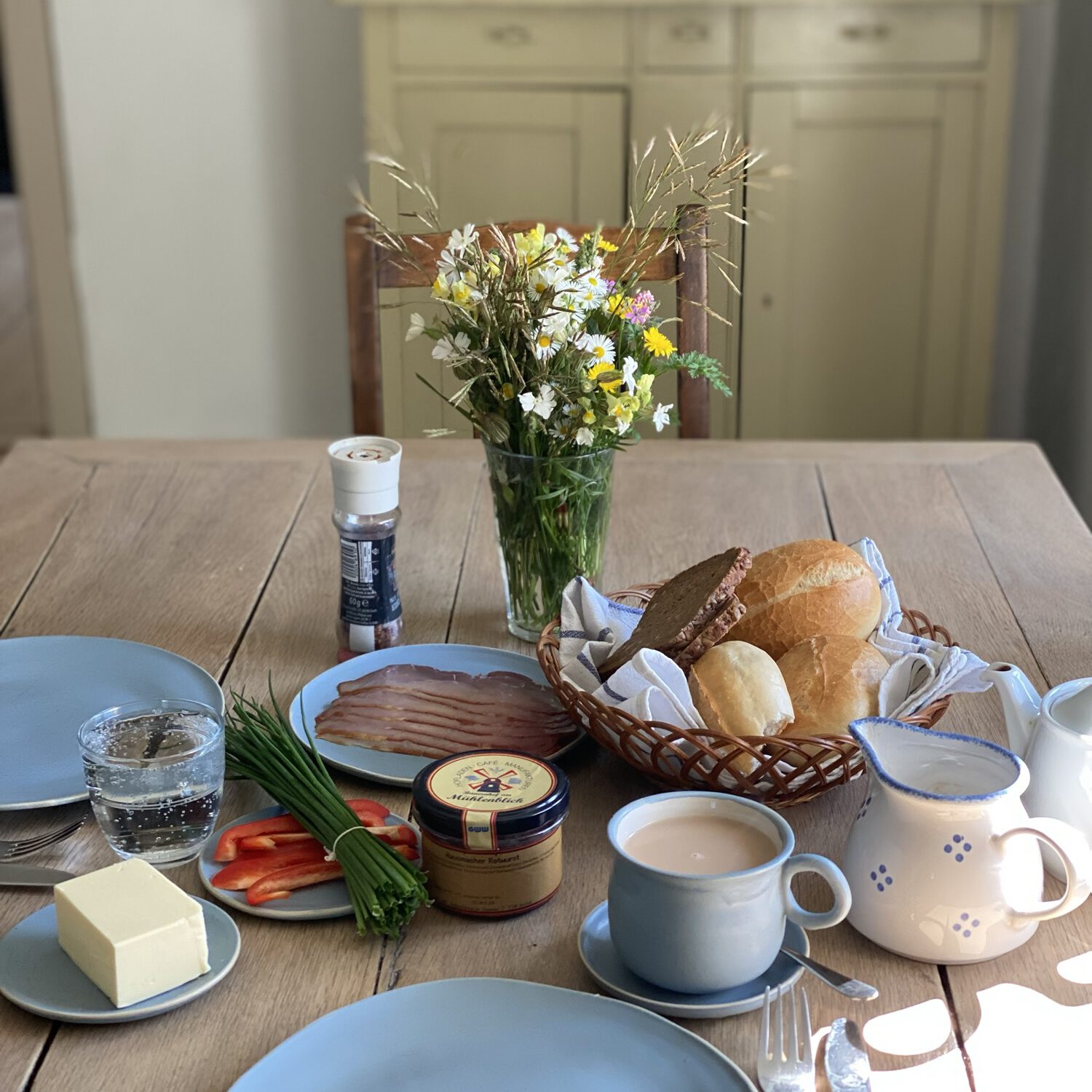 Nach einer Fahrt zum Hofladen, zum Baumarkt und zum Supermarkt gibt’s Frühstück. Der frische Schinkenspeck aus der Region schmeckt fantastisch, der Earl Grey natürlich auch.