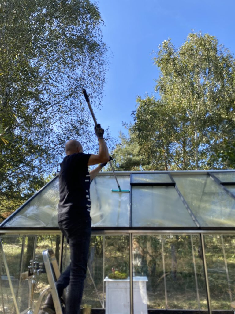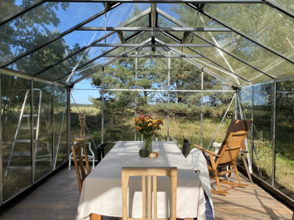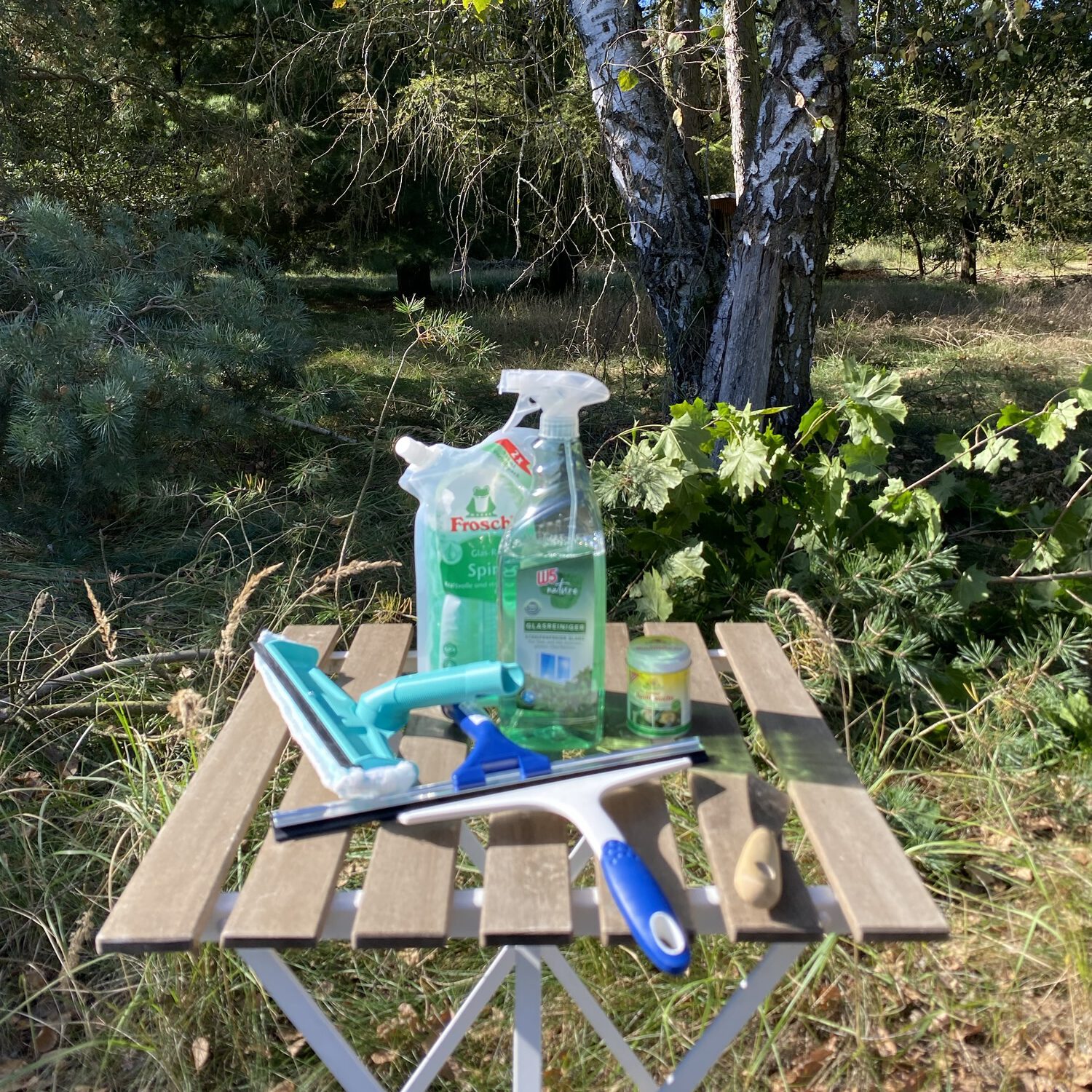 Heute wird unser Glashaus geputzt und weiter eingerichtet. Der Holzboden ist endlich fertig; mein Mann hat ihn im Frühjahr verlegt, lasiert und geölt. Den großen alten Holztisch haben wir umsonst bei Kleinanzeigen in Berlin gefunden. Die Glasscheiben haben aber dringend eine Wäsche nötig; durch manche Scheiben kann man gar nicht mehr durchsehen. Die Bäume und der Wind hinterlassen hier Blütenstaub und anderes.