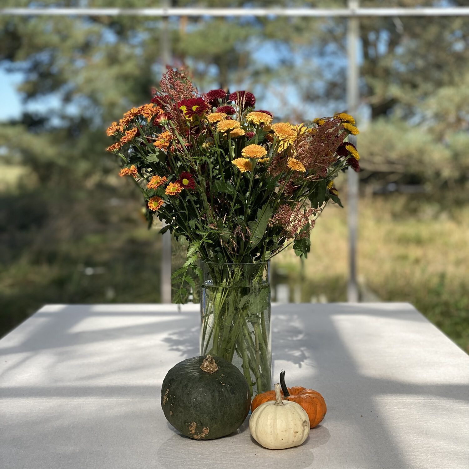Beim Hofladen habe ich Blumen und Zierkürbisse gekauft, denn ohne ein bisschen jahreszeitlichen Schmuck geht es bei mir nicht.