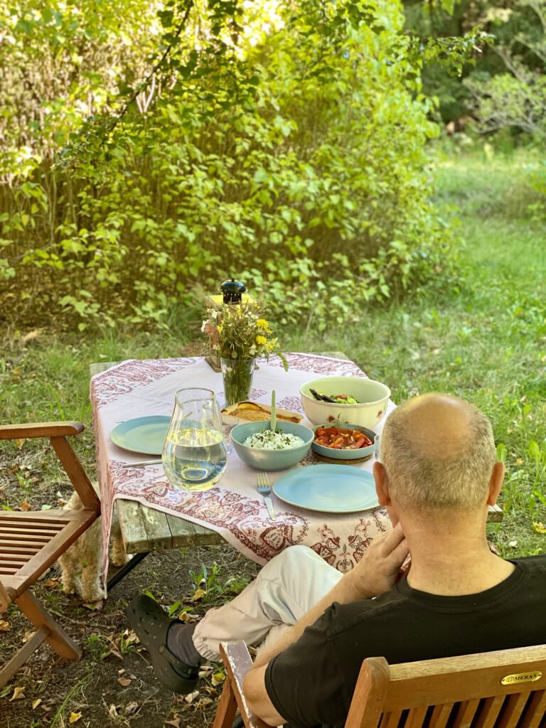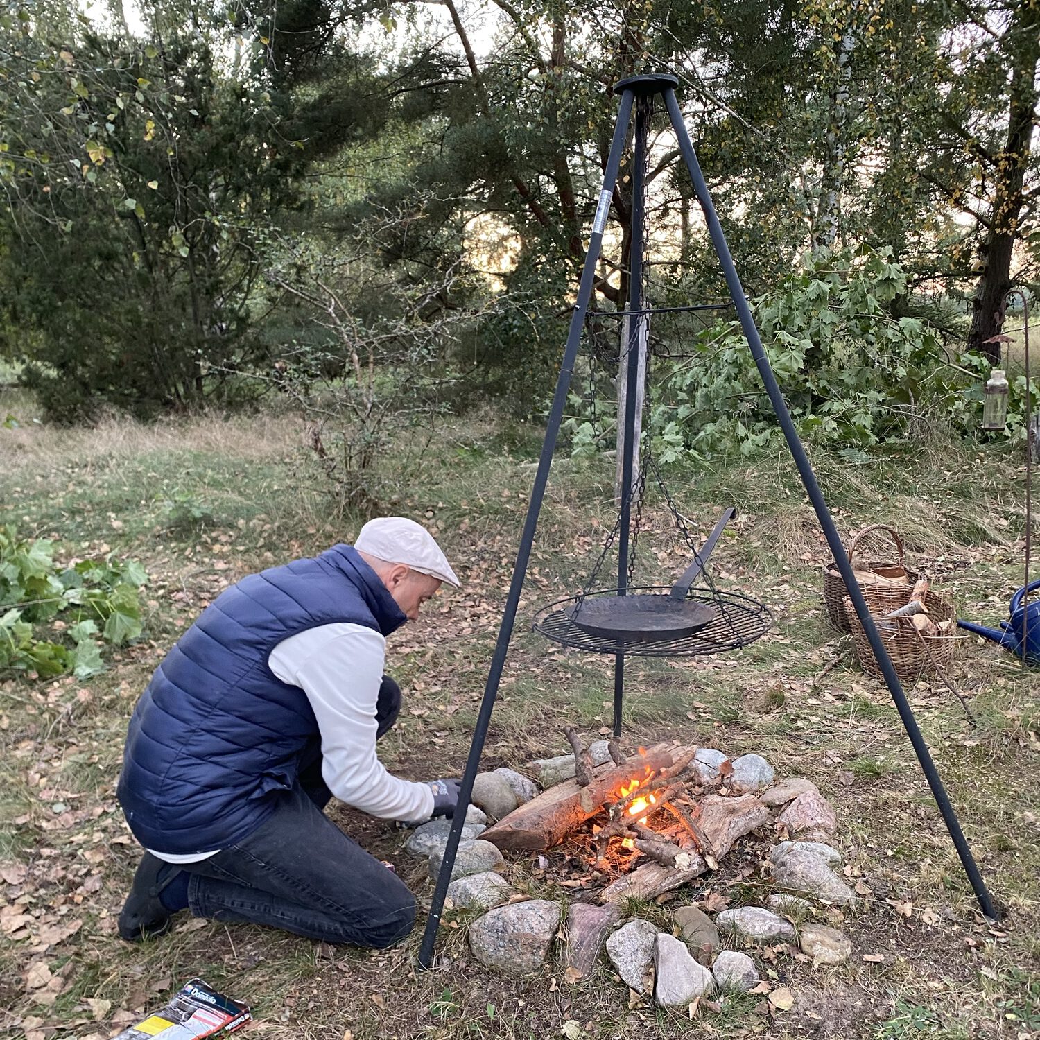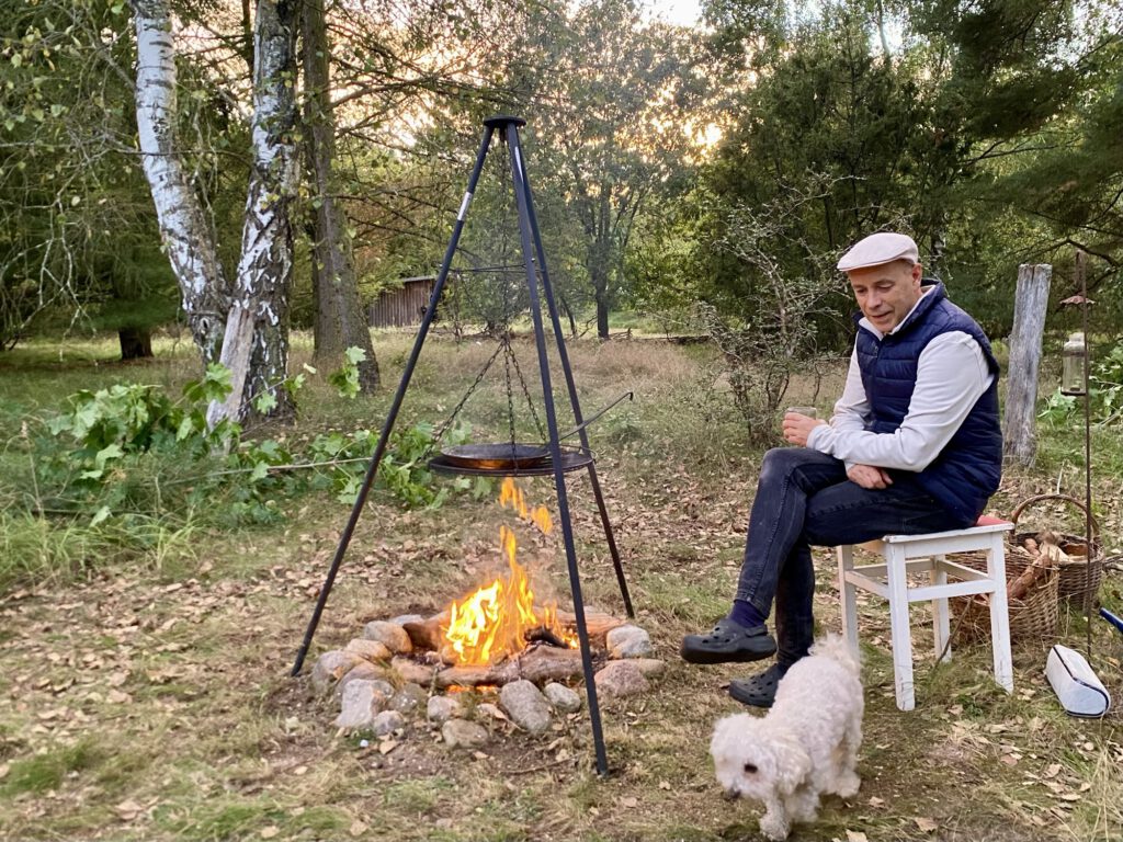 Mein Mann macht Feuer. Wir wollen draußen kochen und im Glashaus essen.