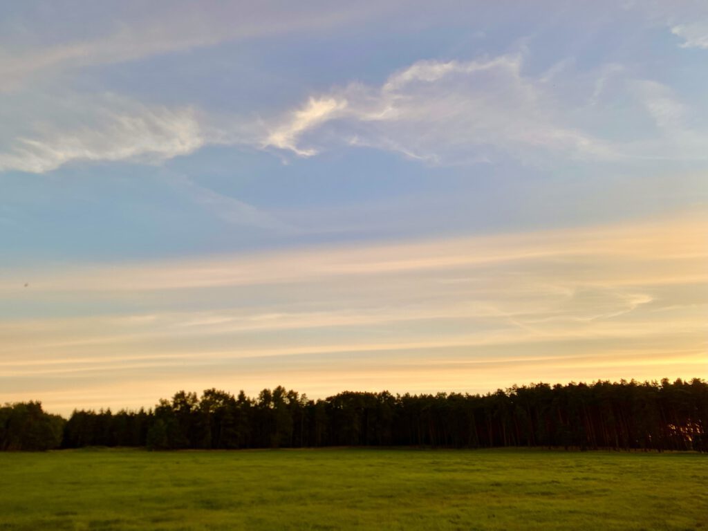 Himmelsleuchten. Besonders schön: der dicke goldene Streifen über dem Wald.