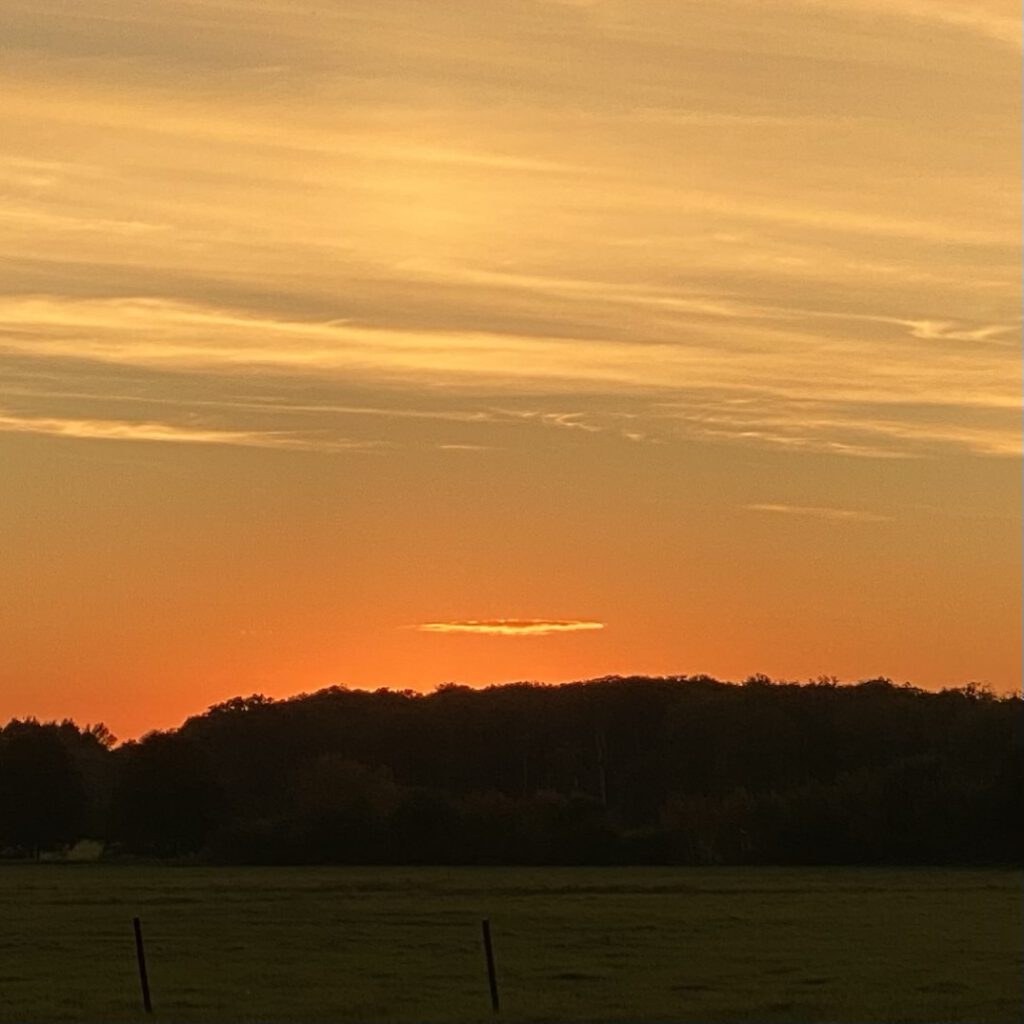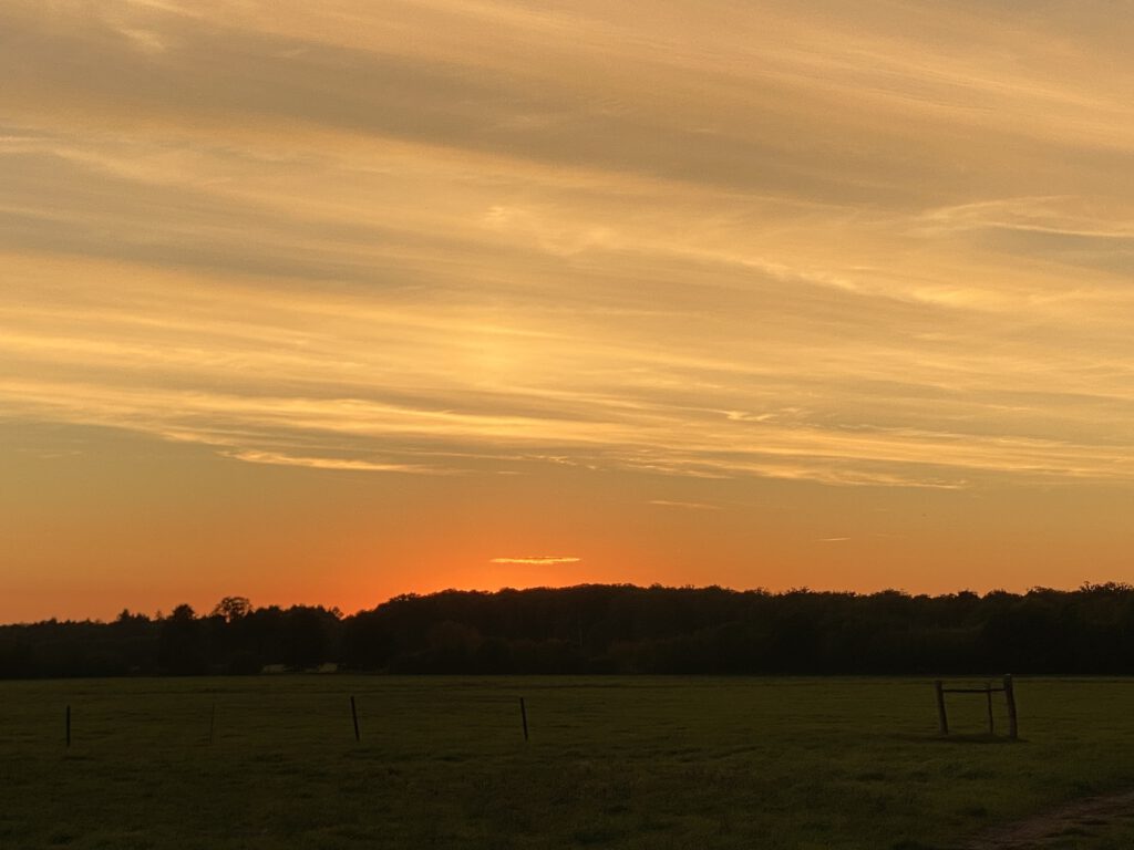 Als ich auf dieses feurige Szenario blicke, galoppiert plötzlich gemächlich ein großer Hirsch mit Geweih nur 50m vor mir von rechts nach links übers Feld (nicht im Bild, ich habe geguckt und nicht daran gedacht zu fotografieren). Er wirkt gar nicht gehetzt, aber er ist ganz allein. Was ist wohl seine Mission? Irgendwie berührt mich dieser Hirsch ganz tief. Ich danke dem Universum für solche Momente.