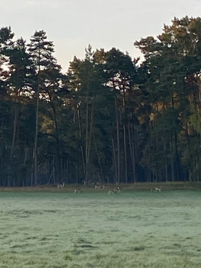 Am Waldrand eine Herde Rehe, die das Handy natürlich auch nicht scharf kriegt. Sie lassen sich von uns gar nicht stören.