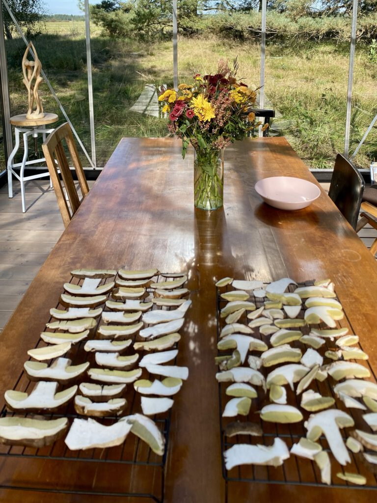 Die Pilzscheiben kommen auf Trockengitter ins Glashaus. Dort wird es bei Sonne so warm, dass wir es als Dörrofen benutzen können.