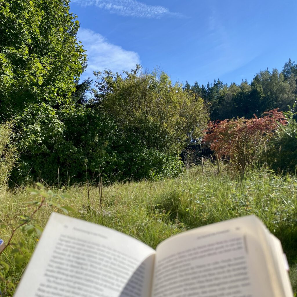 Lesen vor dem Haus. Ich bin in der vierten Runde des „Presence Process“ von Michael Brown (hier mehr dazu; klick) und bin mit dem Lesestoff etwas hinterher. Obwohl ich das Buch nun zum vierten Mal lese, kommen mir manche Stellen so vor, als läse ich sie zum ersten Mal. Das geht aber allen aus dem Buchclub so. Weil man ja echte Transformation erlebt bei dem Prozess, blickt man im Vergleich zu den Runden davor immer wieder anders auf den Text.