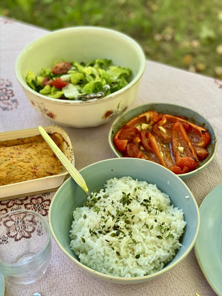 Es gibt grünen Salat mit Tomaten und Schnittlauch, Reis mit Zitronenthymian, Paprika-Tomaten-Gemüse mit Knoblauch und Kräutern der Provence und ein Stück überbackenen Fisch aus dem Supermarkt. Der arme Fisch schmeckt nicht gut (wer bitte kommt auf die Idee, einen Fisch mit Tomaten und KÄSE zu überbacken und das dann noch „auf italienische Art“ zu nennen??? Kein Italiener würde Fisch mit Käse kombinieren), aber wir essen ihn tapfer auf. Die Beilagen sind sooo viel besser und es tut uns leid, dass wir den Fisch überhaupt gekauft haben.