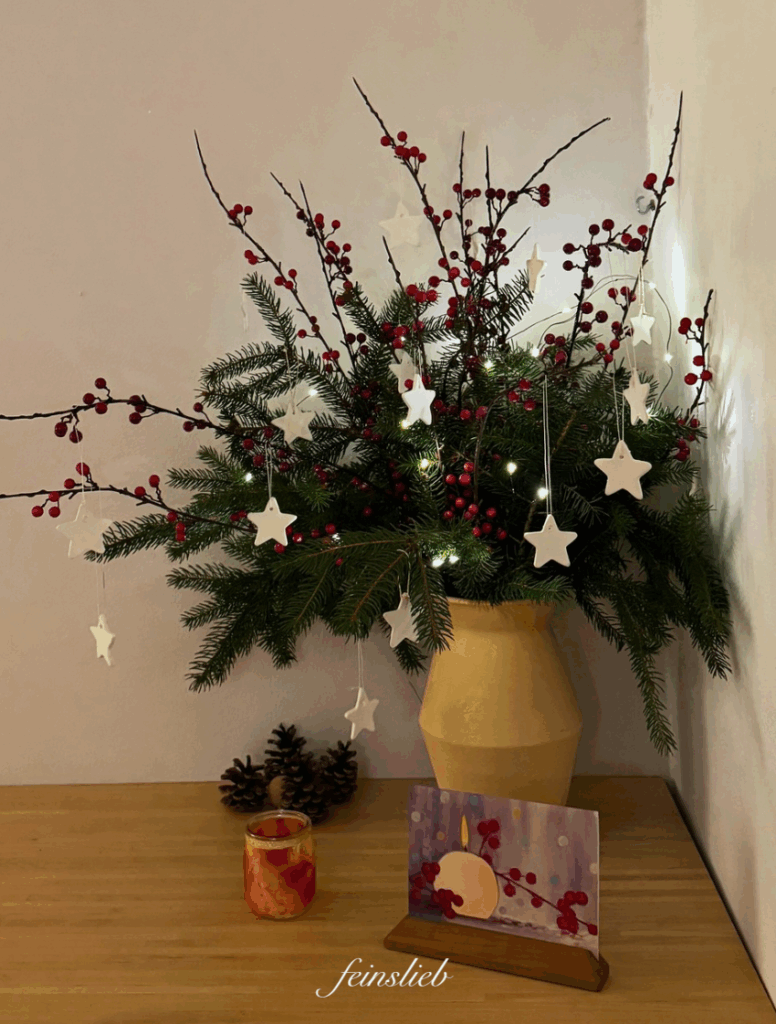 Gestern Nachmittag habe ich in Berlin schon adventlich dekoriert. Besonders gut gefällt mir dieser Strauß mit den selbst gemachten Sternen aus Modelliermasse und der winzigen Lichterkette.