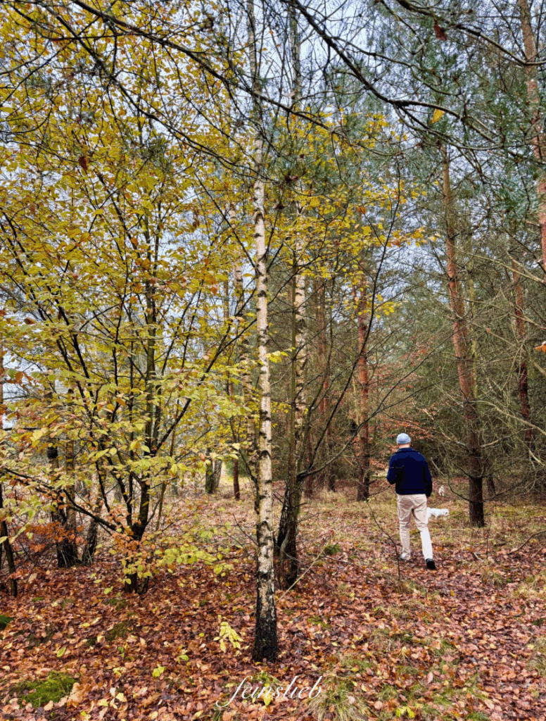 Mein Mann und das große Kind sind schon seit gestern Nachmittag auf dem Land; das kleine Kind und ich kommen heute Morgen ganz früh mit dem Zug hinterher – das Kind kam gestern erst um 18 Uhr von der Schule. Als erstes machen wir mit den Hunden einen Gang übers Grundstück. Wie man sieht, tragen hier manche Buchen noch die Blätter.