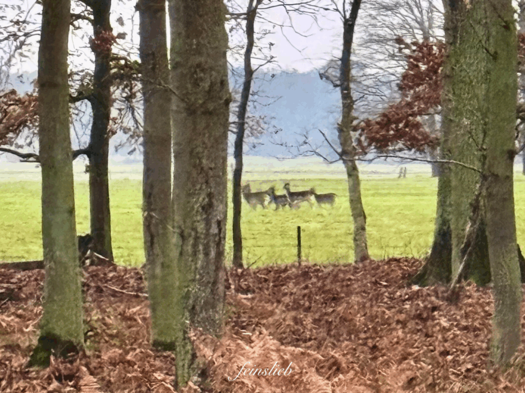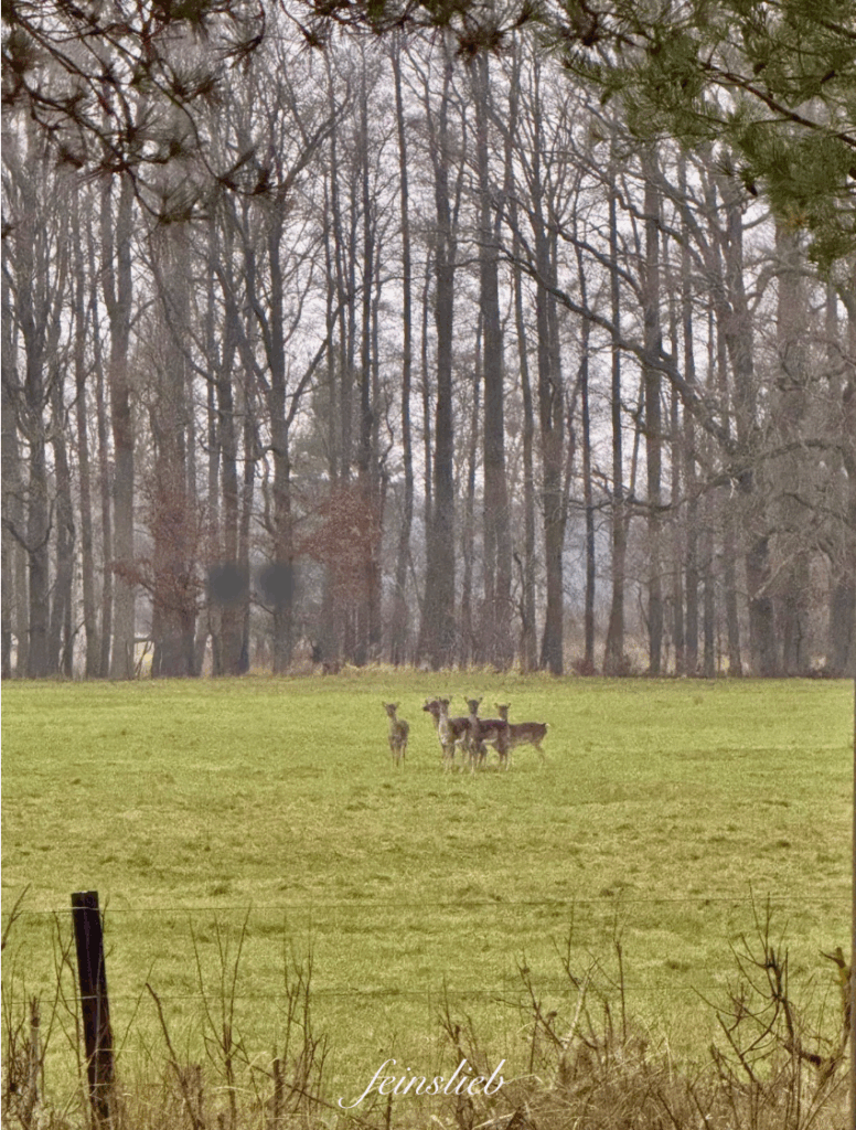 Jenseits des schmalen Waldstreifens steht ein Sprung Rehe und glotzt uns an. Zunächst laufen sie nicht weg.