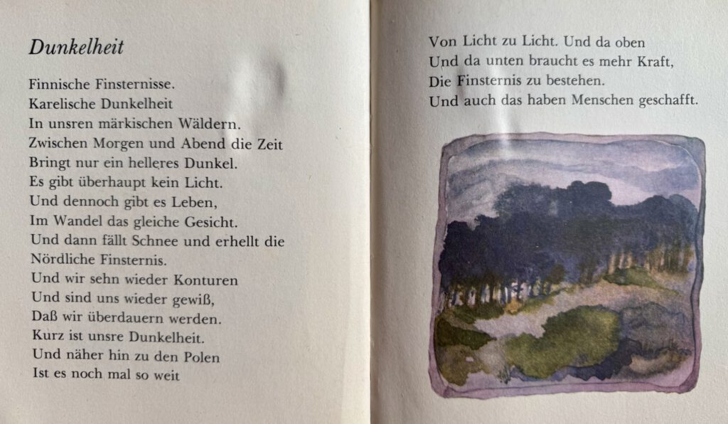 Ich fand, dieses Gedicht von Eva Strittmatter passt gut zur aktuellen Natur-Stimmung. Es darf uns in den nächsten drei Wochen begleiten, in denen das Licht zunehmend weniger wird, besonders hier im Nordosten, in den „märkischen Wäldern“. Hier wird es jetzt schon um 15:30 Uhr dunkel und morgens erst gegen 8 Uhr hell.