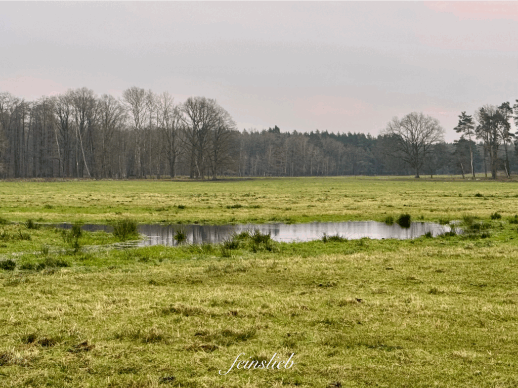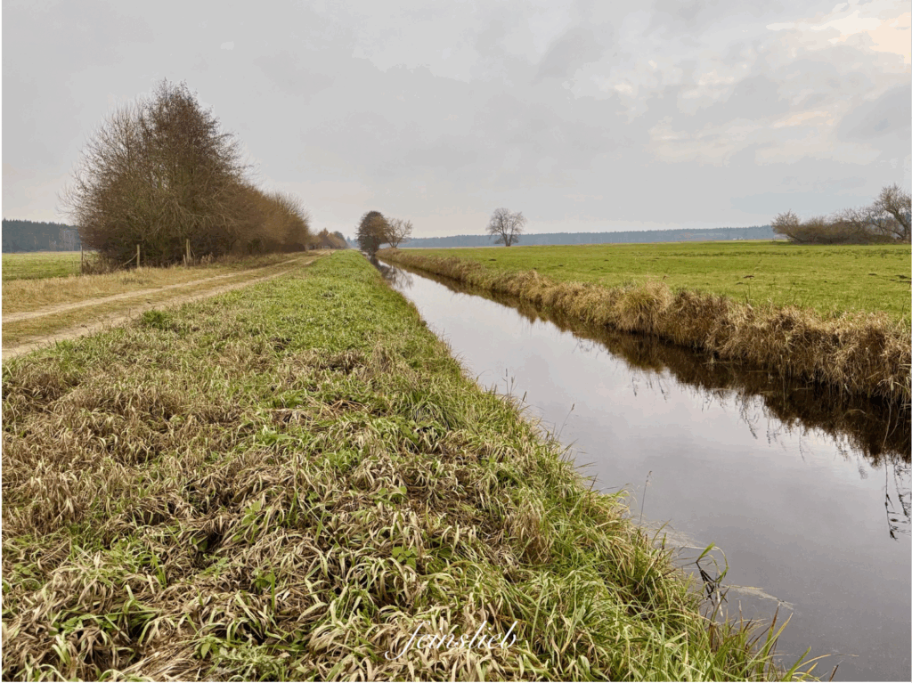 Wir überqueren die große Kuhweide mit den Sielen, die manchmal so schön das Himmelslicht reflektieren. Heute ist da aber nur Grau.