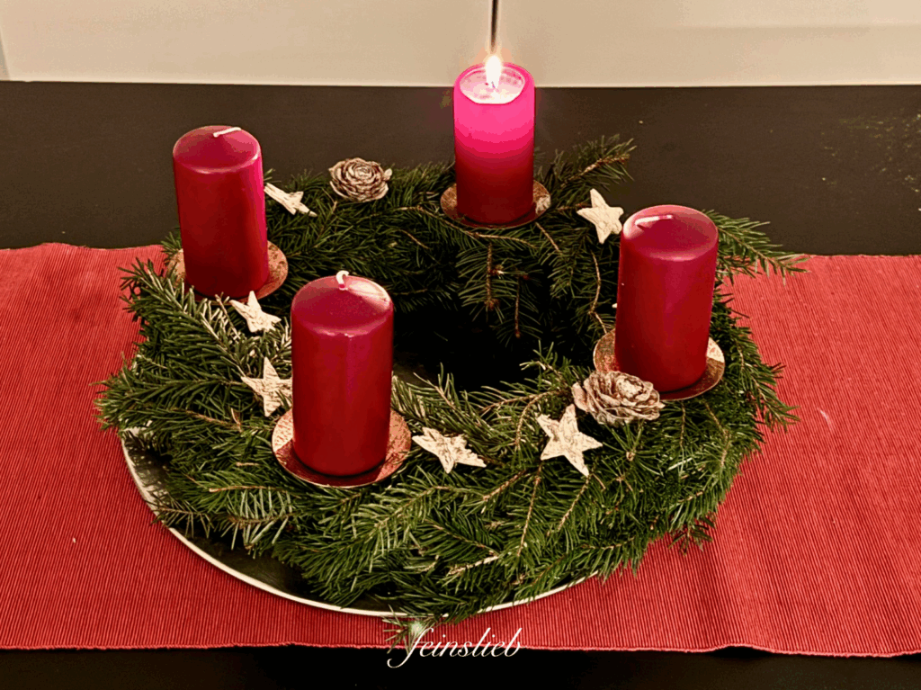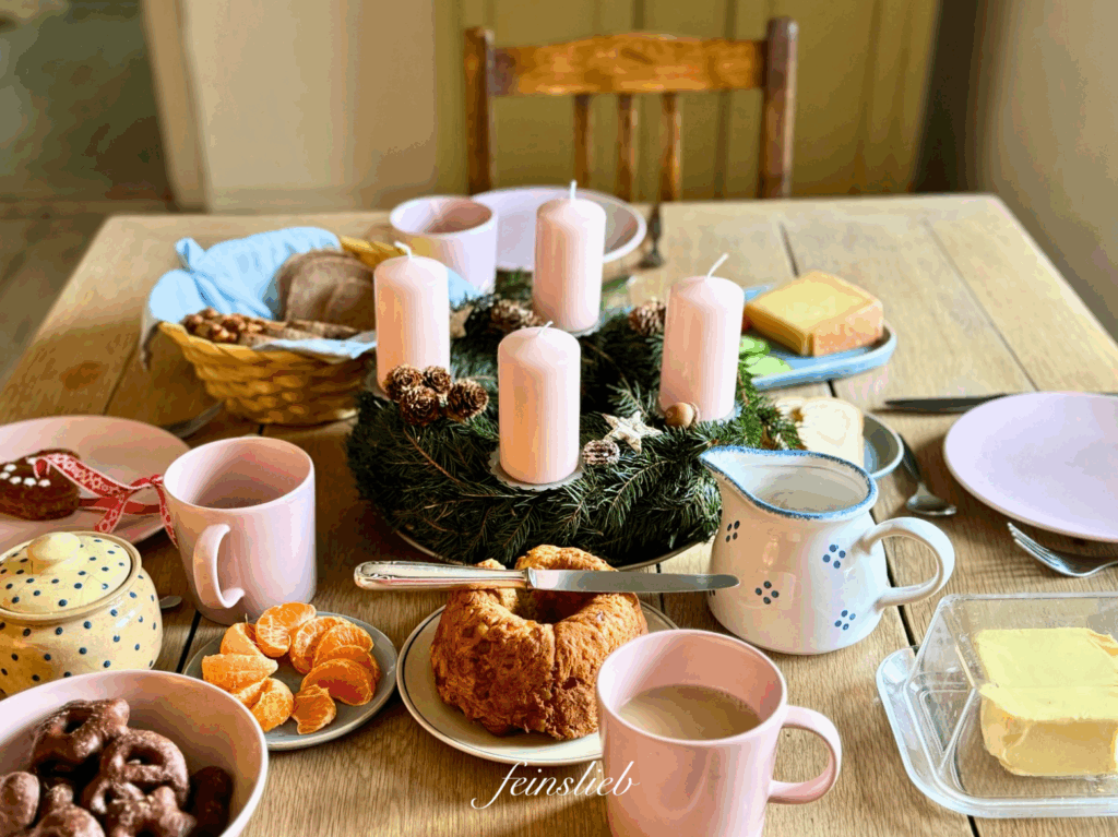 Dafür gibt’s ein buntes Adventsfrühstück. Die jüngere Tochter macht die erste Kerze an und wir singen