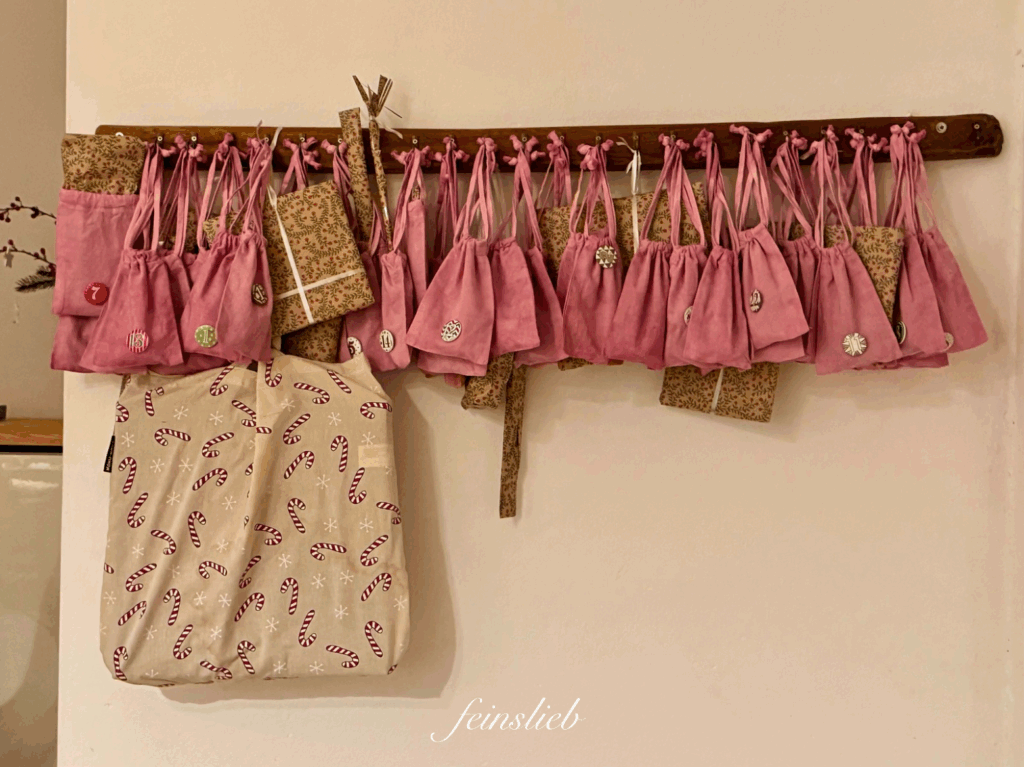Diesen Kalender befülle ich jedes Jahr, seitdem die Kinder mehr wollten als nur Schokorosinen. Bei uns werden diese Säckchen teils mit Süßem (Marzipankartoffel, Dominostein…), teils mit Unternehmungen („Heute gehen wir auf den Weihnachtsmarkt“ / „Heute backen wir Plätzchen“…) und teils mit kleinen Geschenken gefüllt. Geschenke gibt es aber nur alle 3-4 Tage, und es sind gut brauchbare Sachen wie ein Malpinsel, eine Badekugel oder ein Labello. Ich halte mich dabei ganz an meine eigenen 75 Ideen zur Füllung von Adventskalendern.