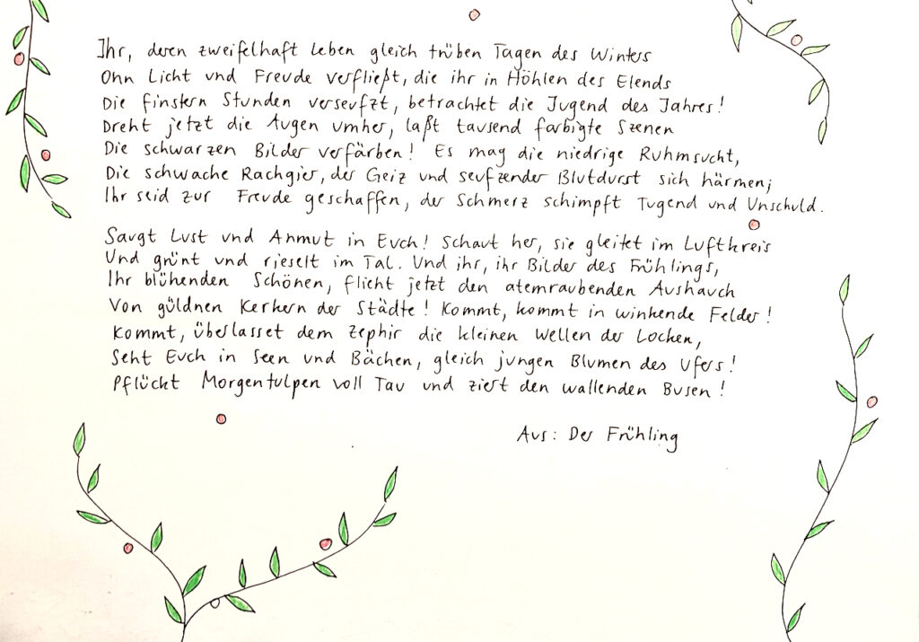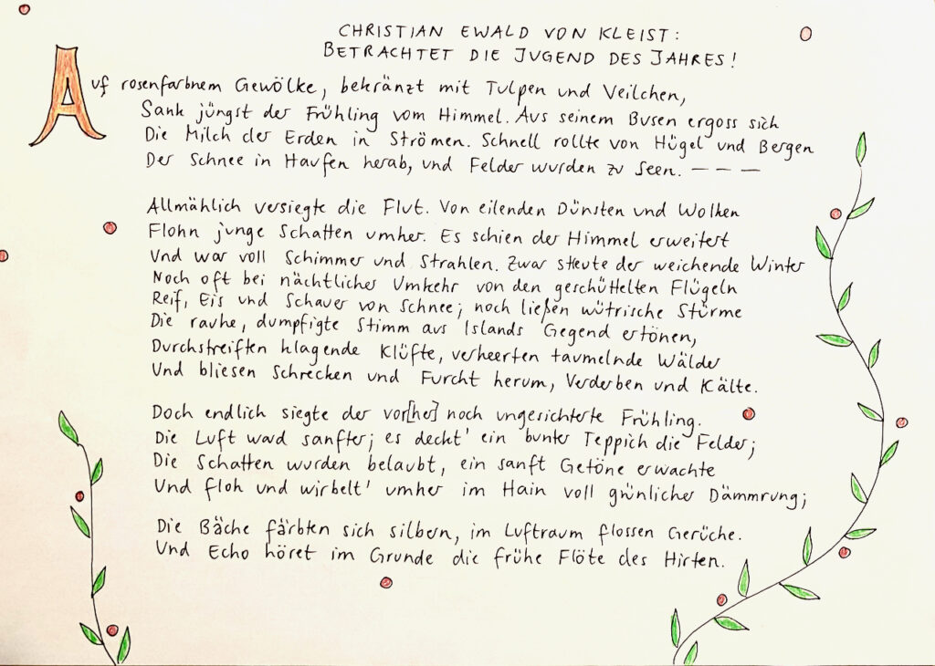Es war ein echtes Frühlingswochenende – und deshalb habe ich dieses herrliche Gedicht über die überschwellenden Kräfte des Frühlingsanfangs von Christian Ewald von Kleist wieder rausgesucht. Ich habe es vor 5 Jahren mal abgeschrieben, weil ich mich hinein vertiefen wollte. Es passt so gut zu diesem Wochenende: