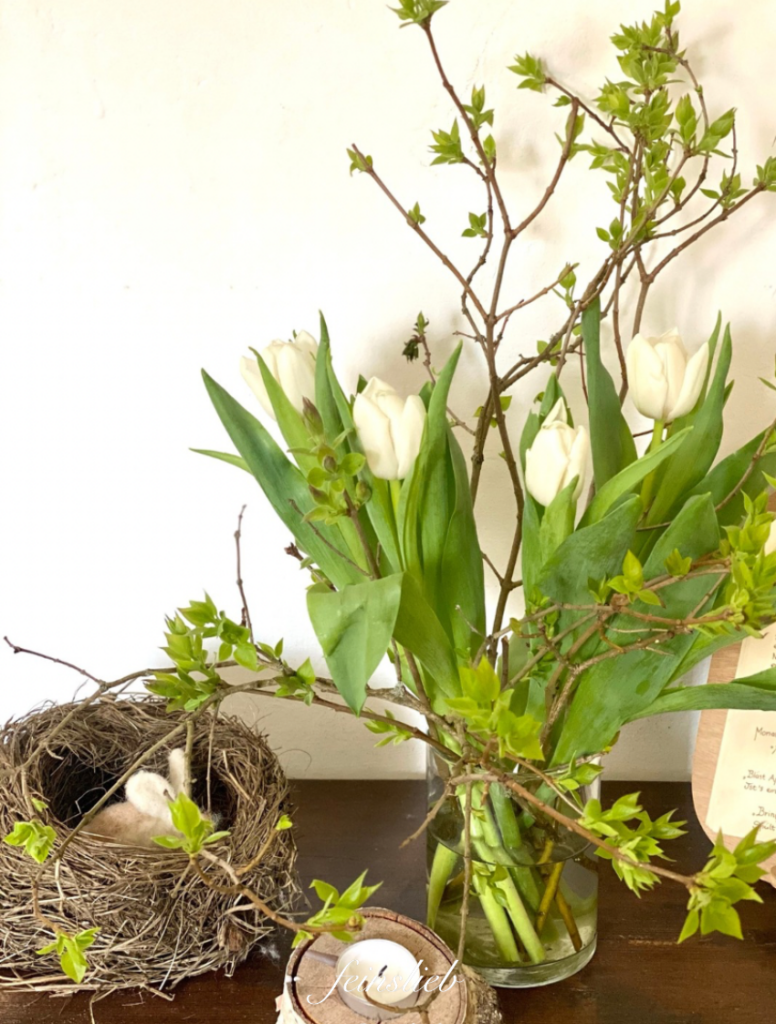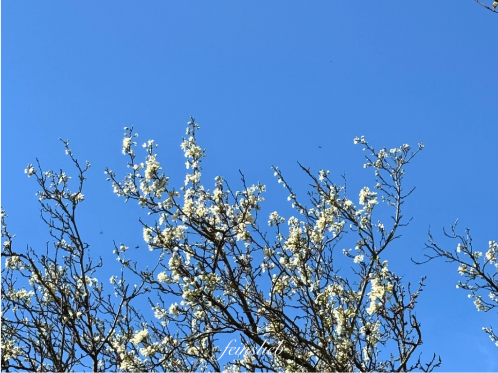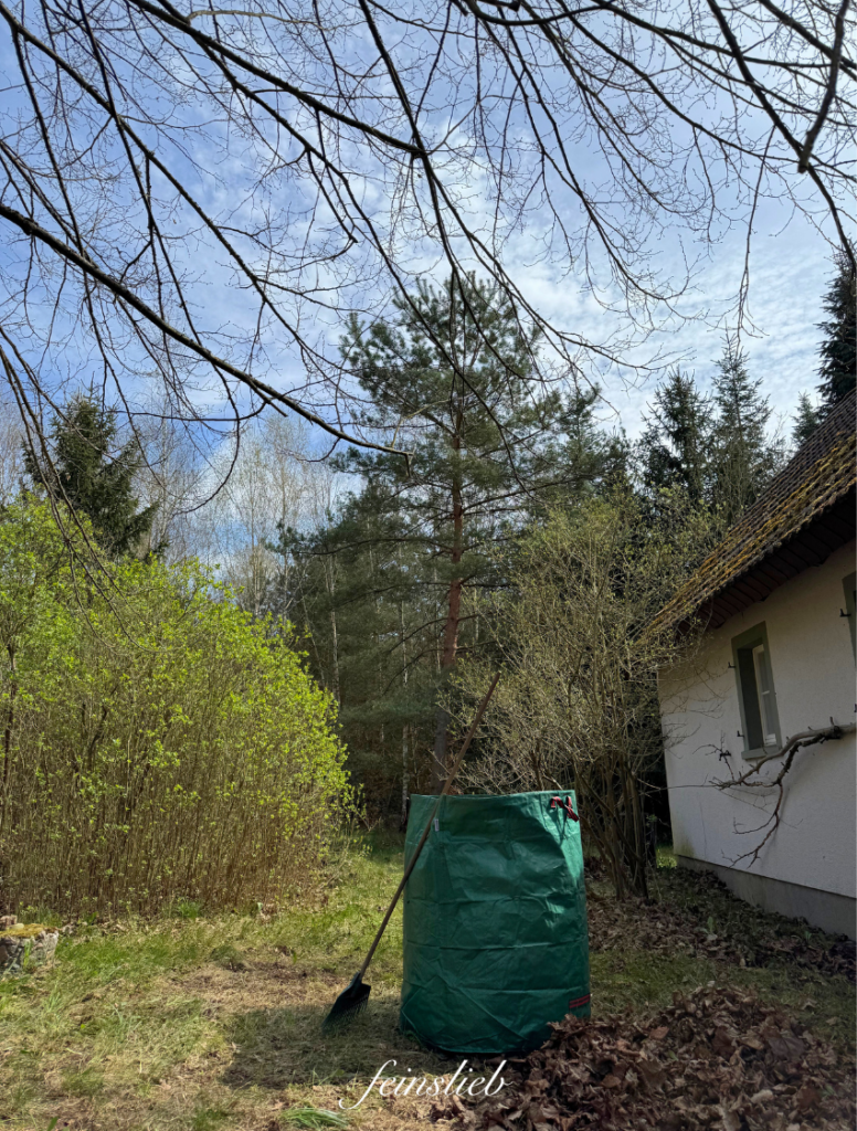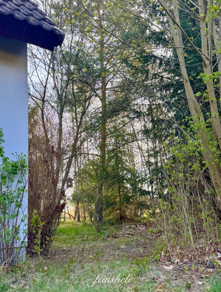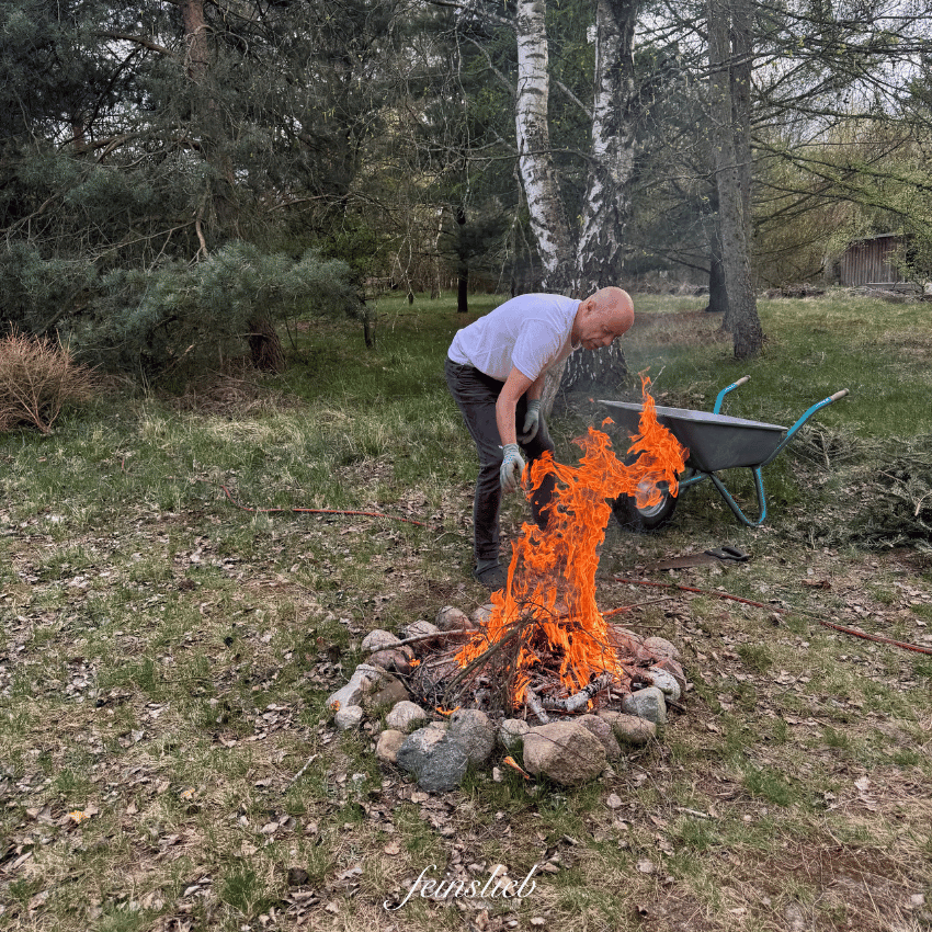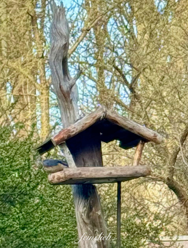 Nach dem Atmen im Rahmen des Presence Process mache ich Sport vor dem Haus. Kraftübungen. Ich mache seit Längerem jeden Tag 30 Minuten Sport, entweder Kraft oder Workouts für Kondition, oder Faszientraining oder andere Dinge. Es tut mir so, so gut. Ich will es nicht mehr missen. Ich LIEBe das Körpergefühl von leichtem Muskelkater nach Kraftübungen. Es macht mir meinen Körper so sanft bewusst; so kann ich leichter in ihm präsent sein – was mir ja generell schwer fällt.Ich bin total entzückt: Die Vögel stören sich überhaupt nicht an meiner Gegenwart. Unser Futterhäuschen, das nur 3 Meter von mir entfernt ist, wird in meiner Gegenwart von total vielen Vögeln besucht: Kleiber (im Bild), Weidenmeise, Blaumeise, Buchfink, Drossel, Rotkehlchen und Grauschnäpper. Und als ich einmal aufgucke, sehe ich über mir VIER WIEDEHOPFE fliegen. Wir haben sie gestern schon rufen hören – ihr Ruf ist ja unverwechselbar. Sie machen U-pu-pu (kleine Pause) U-pu-pu … – und ihr lateinischer Name lautet auch Upupu epops 🙂 (Ich liebe es!). Man kann sie leicht erkennen, wenn sie über einem fliegen — sie sind ein bisschen größer als Tauben und etwas gedrungener, und sie haben einen orangenen Bauch und schwarze Schwanzfedern.Die Tulpen und Traubenhyazinthen sind endlich aufgeblüht. Hier im absoluten Nordosten Deutschlands kommt der Frühling spät.Zum Mittagessen machen wir uns Grüne Sauce mit Eiern und Kartoffeln. In der grünen Sauce sind frische Frühlingskräuter, die rund ums Haus wachsen – Vogelmiere, Giersch und Brennnessel. Außerdem ein TK-Kräuterpäckchen aus dem Supermarkt.Ich mache Instagram Reels und brauche dafür Cover Fotos; hier eines davon.Hundespaziergang nach dem Mittagessen. Die Sonne strahlt schon so schön warm. Ich habe ja eine sehr helle, empfindliche Haut und brauche heute Sonnencreme.Unser Haus beim Rückweg. Es liegt so schön mitten in der Natur.Wir fegen noch Laub vom Herbst zusammen und bringen es an einer andere Stelle des Grundstücks, wo invasives Gras wächst. Wir haben festgestellt, dass es hilft, wenn wir das „böse Gras“ mähen und dann Laub auf die Stellen tun. Das Laub nimmt das Licht weg, so dass das Gras erstmal nicht wachsen kann. Wir haben keine Ahnung, ob das nachhaltig hilft, aber wir haben festgestellt, dass seit den 3 Jahren, seitdem Laub auf den kritischen Stellen liegt, kein invasives Gras mehr nachgewachsen ist. Also bleiben wir erstmal dabei.Mein Mann verbrennt unseren Weihnachtsbaum in einer Art spätem Osterfeuer.Am Abend nochmal raus mit den Hunden. Auf der großen Wiese steht die große Hirsch-Herde, die hier in der Nähe zu Hause ist. Wir sehen sie öfter. Aber heute sind es besonders viele Hirsche. Mindestens 40 Stück. Wir freuen uns immer über diesen Anblick und sind ganz leise und defensiv, um sie nicht zu stören. Beglückt gehen wir nach Hause und ins Bett.