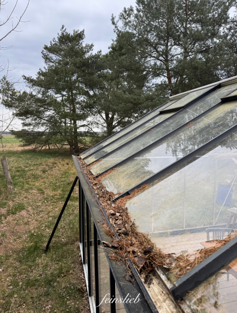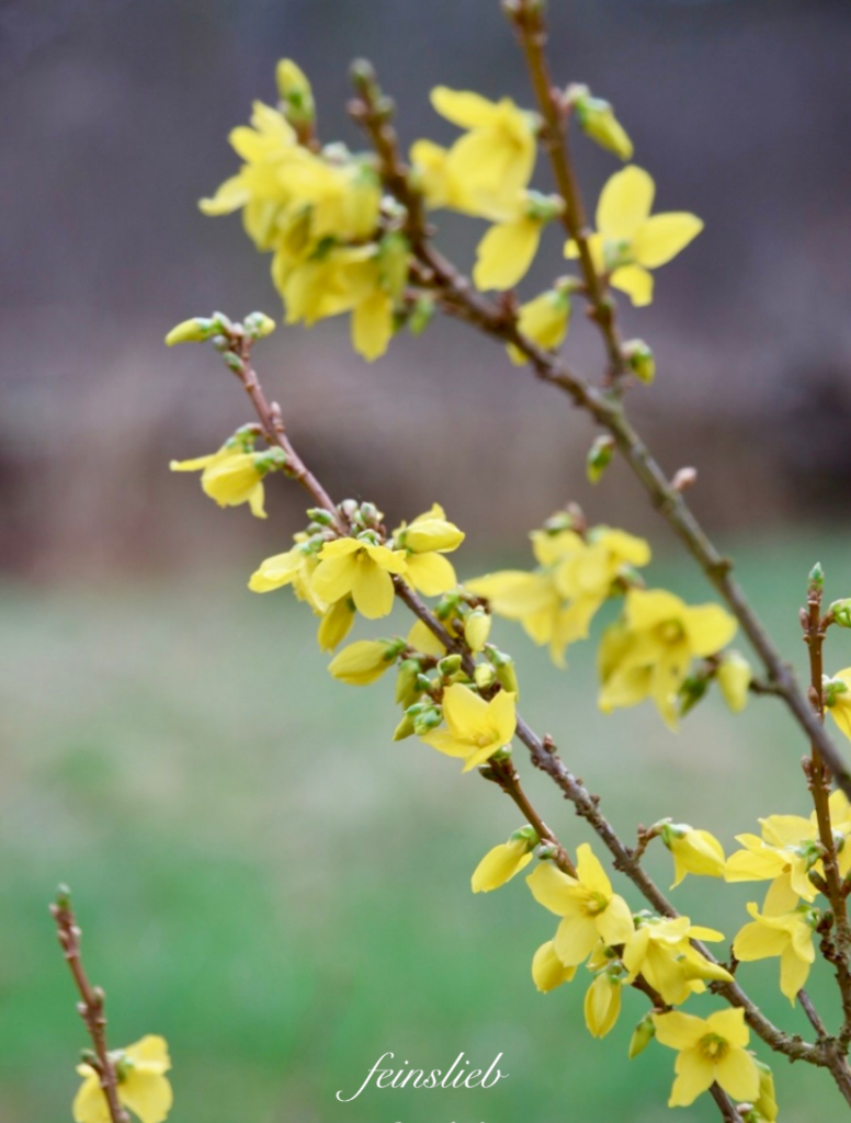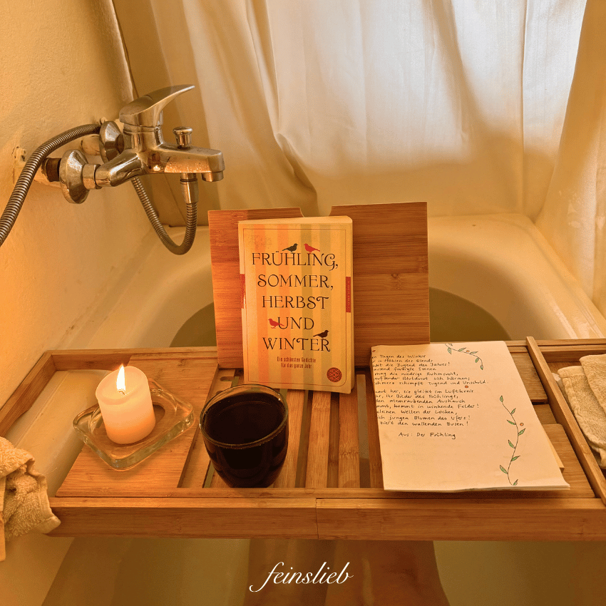 Hundespaziergang ganz früh morgens um 6:30 Uhr. Ich darf eine Gruppe Hirschkühe am Waldrand beobachten. Sie stehen dort ganz still, obwohl wir nur 150m entfernt sind. Als wir vorsichtig näher kommen, hüpfen sie zögernd in den Wald (das Video dazu hab ich auf Instagram in meinen Storys gepostet.)Ich nehme ein Bad und suche das Gedicht für diesen Beitrag aus. Dazu gibt es Cola, eins meiner Guilty Pleasures. Ich LIEBE Cola und gönne sie mir oft. Ich habe mehrere Guilty Pleasures, z.B. Milchschnitte (die ich mir aber nicht so oft gönne, wie ich sollte… ich wünschte, es gäbe einen Engel, der mir ab und zu einfach Milchschnitte in den Kühlschrank legt, ohne dass ich sie kaufen muss 🙂 ) — und Nimm 2. Oh Gott, Nimm 2 ist so lecker, aber immer, wenn ich zu viel davon lutsche, tut mir der Gaumen weh (bedaure ich aber nicht! Es ist zuuu lecker!). Und manchmal auch Chips, am liebsten Salt & Vinegar Chips — soo gut! Am besten, wenn sie so richtig zart sind. Hmmm! — Schreib mir gern deine Guilty Pleasures in den Kommentaren!!! Ich nehme gern Anteil und lass mich davon inspirieren!Mein Mann hat gestern unsere Flickenteppiche gewaschen und sie jetzt von der Wäschespinne genommen.Auch unsere Mini-Forsythie blüht. Sie ist in den letzten 9 Jahren kaum gewachsen. Der Boden hier ist leider extrem unfruchtbar, weil sehr, SEHR sandig. Er besteht gefühlt aus 80% Sand. Echte Heidelandschaft hier. Dafür wächst hier Wacholder und Sanddorn (der aber auch keine Früchte trägt, aber trotzdem schön ist).Wir säubern heute die Regenrinnen des Glashauses von herabgefallenen Nadeln, Blättern und kleinen Zweigen. Als wir das Glashaus gebaut haben, haben wir nicht gedacht, dass die echt weit entfernte Lärche ihre Blätter hier so nachdrücklich hinterlässt, außerdem die Kiefern und der Ahorn… die Bäume sind überhaupt nicht nah dran am Glashaus. Der Wind scheint hier große Leistungen zu vollbringen.