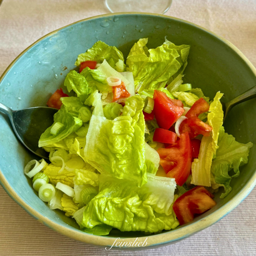 Zum Mittagessen gibt’s Salat und Rindersteaks.