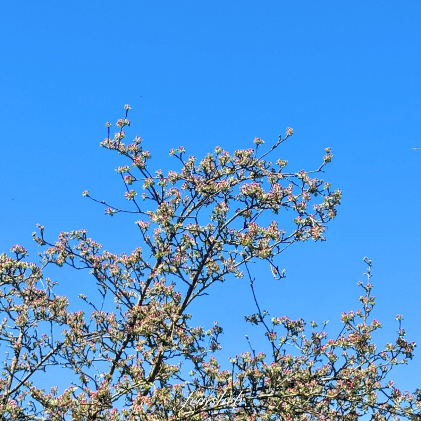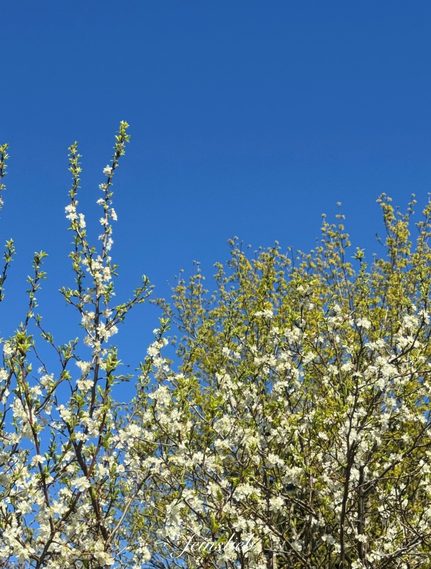 Die Pflaumenbäumchen stehen in Blüte. Und der Himmel ist so blau.