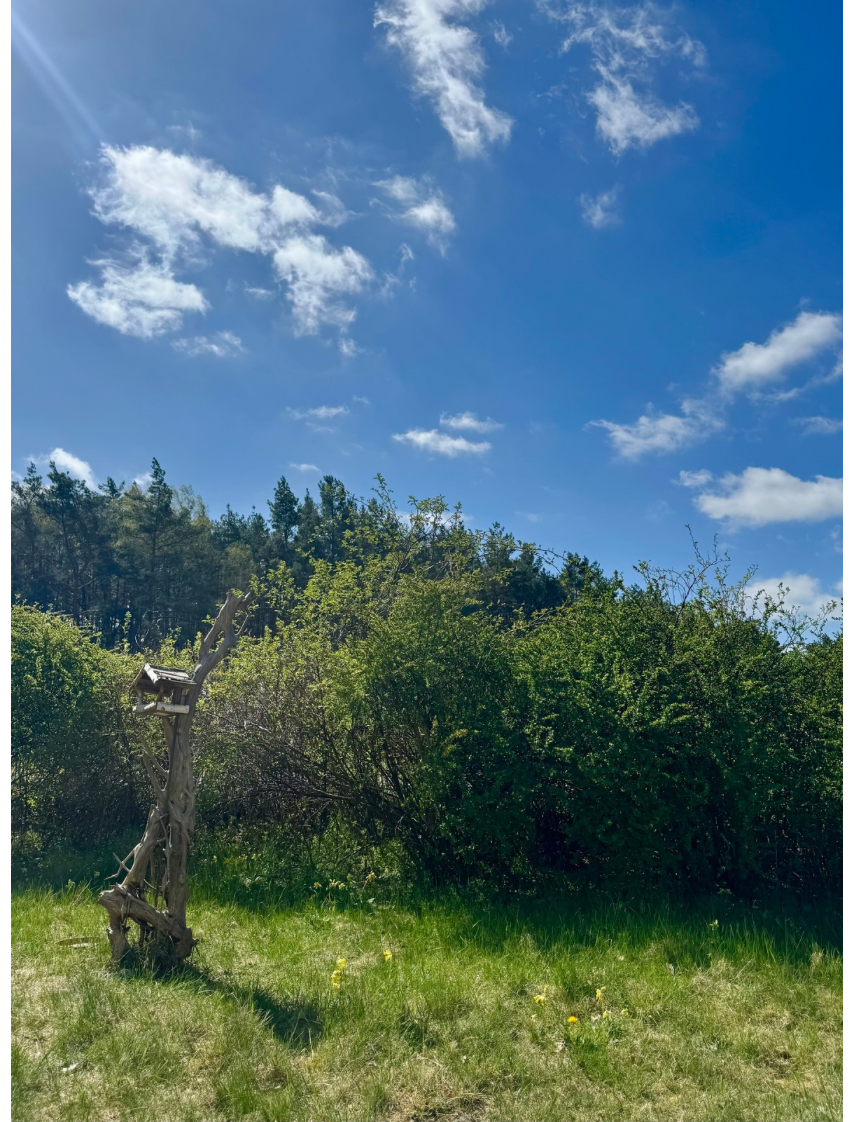 Eins ist aber gar nicht so schlecht: Die Verletzung zwingt mich zum Stillsitzen und Nichtstun. Ich bin ja so ein Typ, der immer unterwegs ist, immer am Machen. Heute aber sitze ich den ganzen Tag fast irgendwo herum und lese. Sehr lange auf der Bank vor dem Haus in der Sonne, mit Blick auf das Vogelhäuschen und den blauen Himmel.