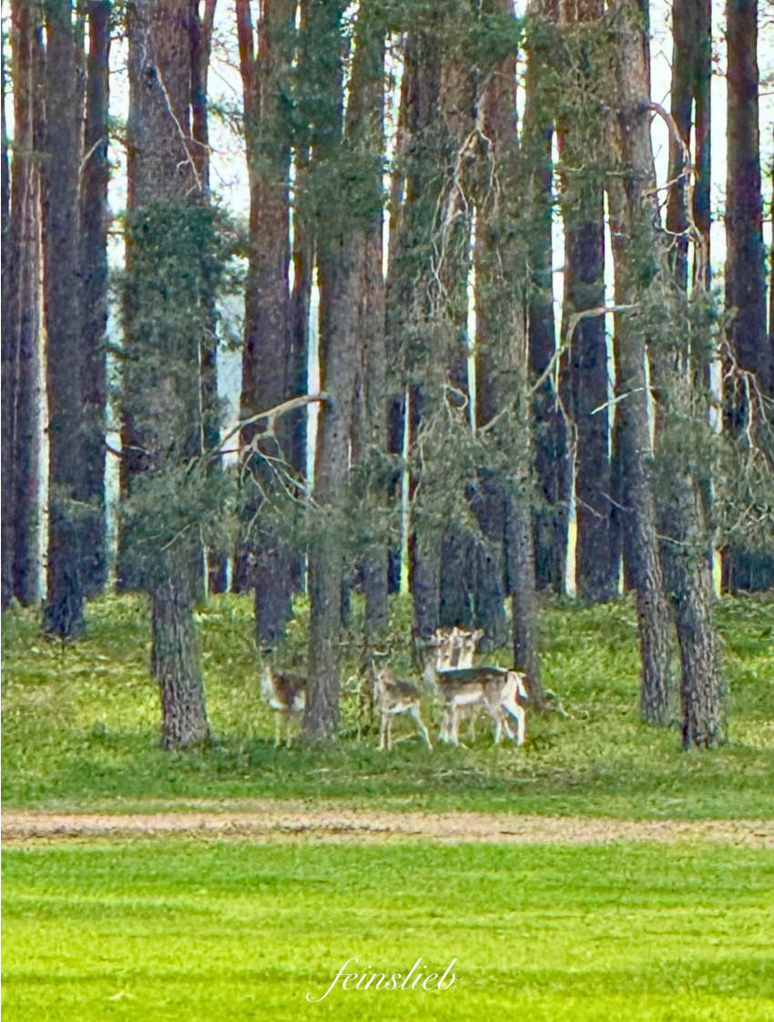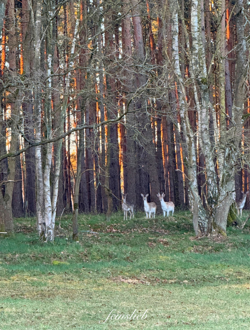 Nach dem Mittagessen wage ich es, vorsichtig und langsam und mit den Hunden spazieren zu gehen. Wir sehen diese Hirsche mit weißen Bäuchen am Waldrand. Sie schauen uns ganz neugierig an.