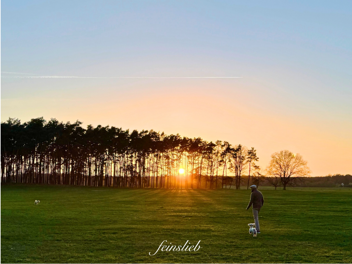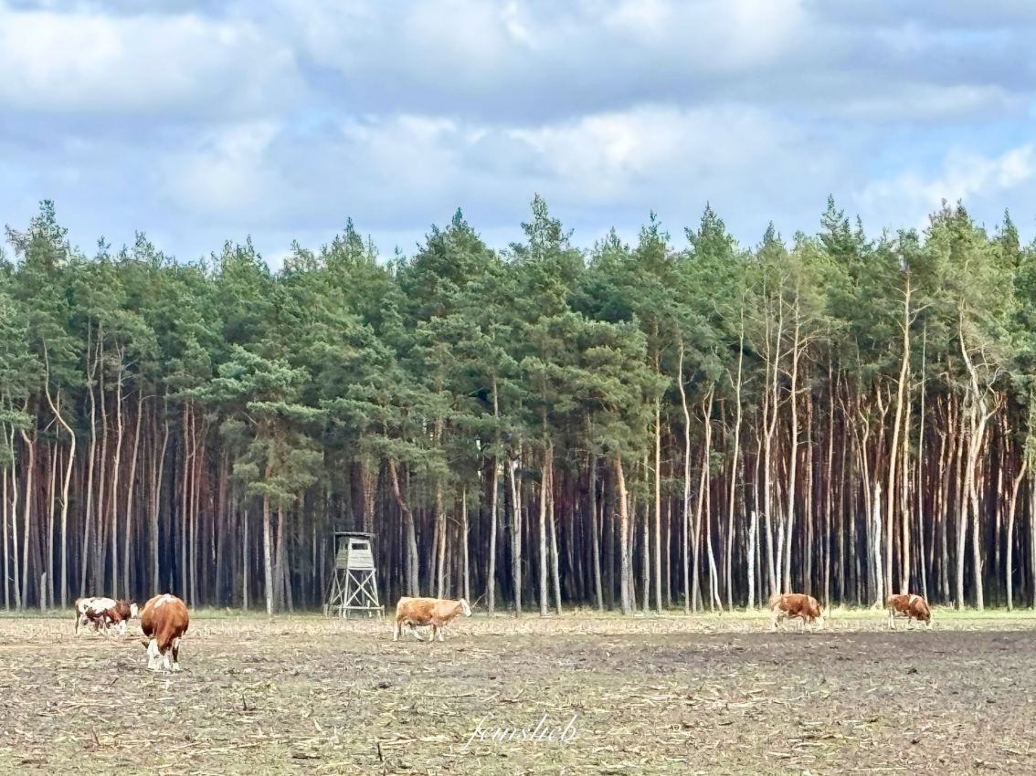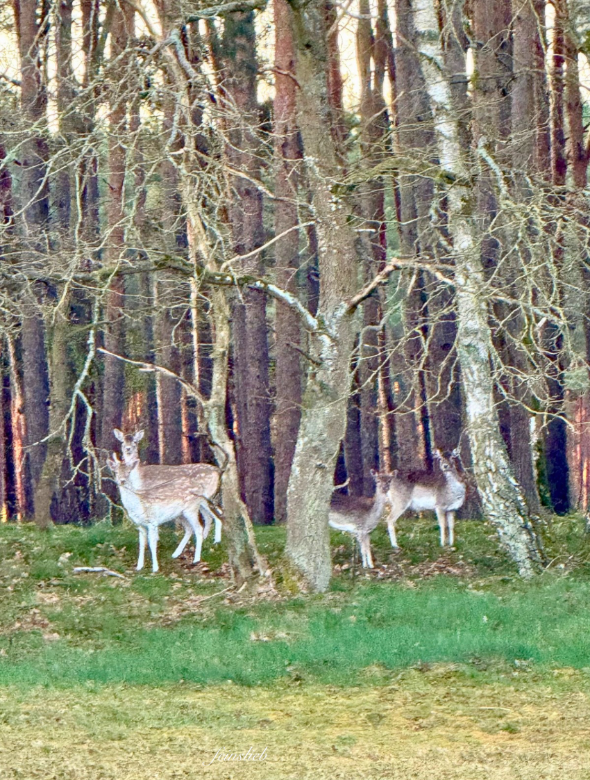 Heute geht es der Rippe schon viel besser – es tut nicht mehr ganz so schlimm weh. Weil ich ganz früh aufwache, gehe ich um 6 Uhr mit den Hunden raus. Die Gruppe Hirschkühe mit den weißen Bäuchen hat wohl auf unserem Grundstück übernachtet — als wir losgehen, hüpfen sie aus unserem Wäldchen hinüber zum Waldrand und schauen uns von dort aus ganz in Ruhe zu, wie wir an ihnen vorbeigehen.