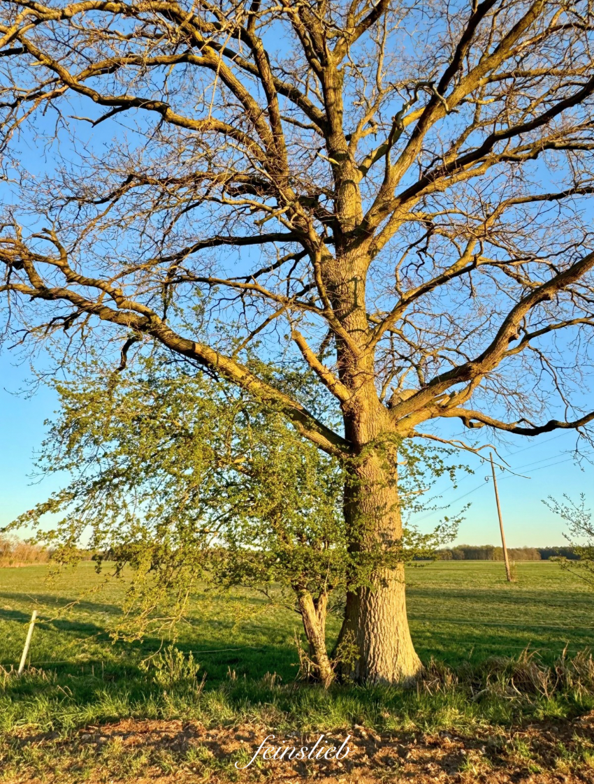 Neben dem Weg die dicke Eiche mit dem Rotdorn. Ich mag diese Symbiose – dass die beiden so eng beisammen stehen.