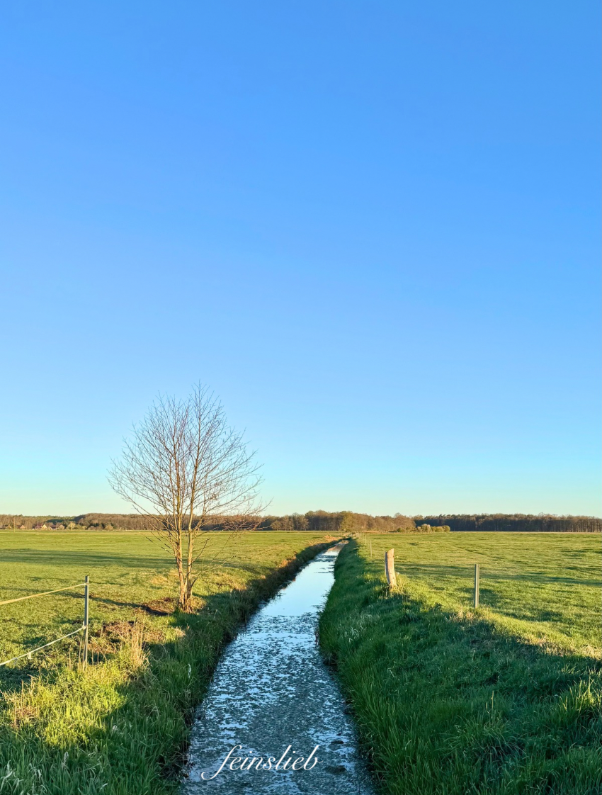 Der Graben leuchtet im Morgenlicht. Um uns herum sirren die Feldlerchen. Kraniche sind hier auch unterwegs; man hört ihr Schreien.