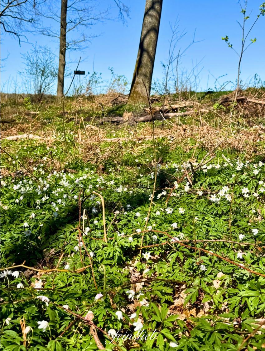 Mein Mann und ich waren wieder zusammen auf dem Land; unsere beiden Teenager wollten in Berlin bleiben. Die Bäume treiben aus und tragen diese zarte hellgrüne Farbe, die es nur zu dieser Jahreszeit gibt. Man sieht zwischen den winzigen Blättern noch die Äste und Zweige, was wahrscheinlich nächstes Wochenende nicht mehr der Fall sein wird. Bei uns auf dem Land blühen noch die Schlüsselblumen, und im Wäldchen stehen die Anemonen. Sogar die ersten Maiglöckchen habe ich auf unserer Sonnenseite schon gefunden. Der Frühling ist da!!!