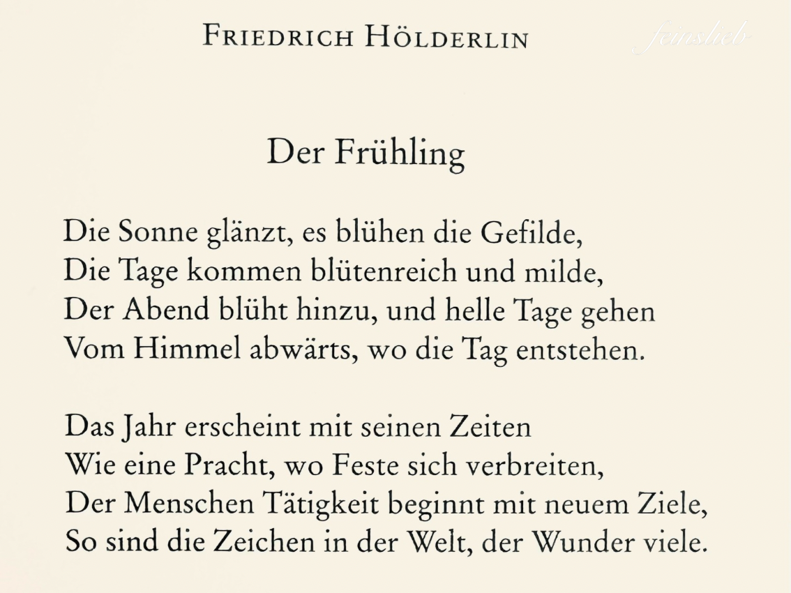 Deswegen und weil ich selbst tatsächlich „mit neuem Ziele“ tätig bin, habe ich dieses Gedicht von Hölderlin herausgesucht. Wir haben diese Woche so schöne Nachrichten erhalten, dass wir gerade das Gefühl haben, bei uns passieren wirklich „der Wunder viele“.
