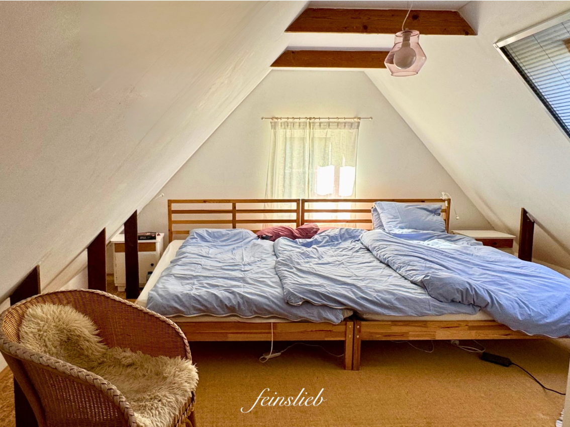 Bevor wir abfahren, beziehen wir unsere Betten frisch. Das hier sind zwei große Doppelbetten, die zusammen 3,60m breit sind. Das war früher unser Familienbett; jetzt schlafen die Kinder im Zimmer nebenan in eigenen Betten. Ich genieße es hier, ein ganzes Doppelbett für mich allein zu haben 🙂