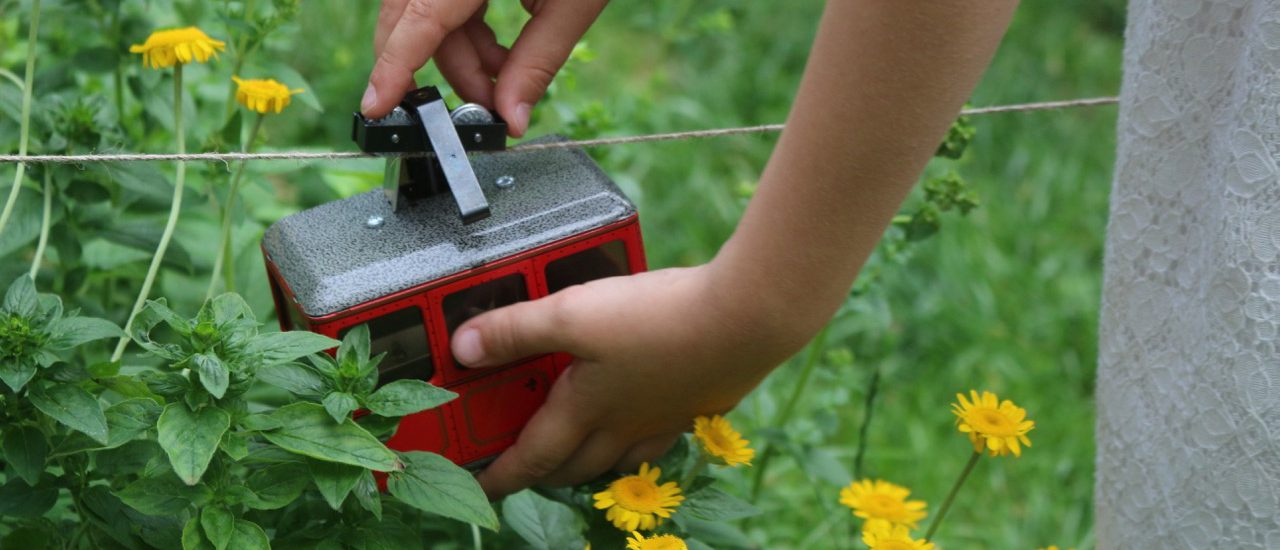 Die Kinder bauen derweil im Garten unsere kleine Seilbahn auf. Sie probieren lang herum, bis die Seilbahn wirklich fährt. Man zieht sie mit einem Schlüssel auf, dann fährt sie das Seil entlang, das sogar ein bisschen bergauf gehen darf.
